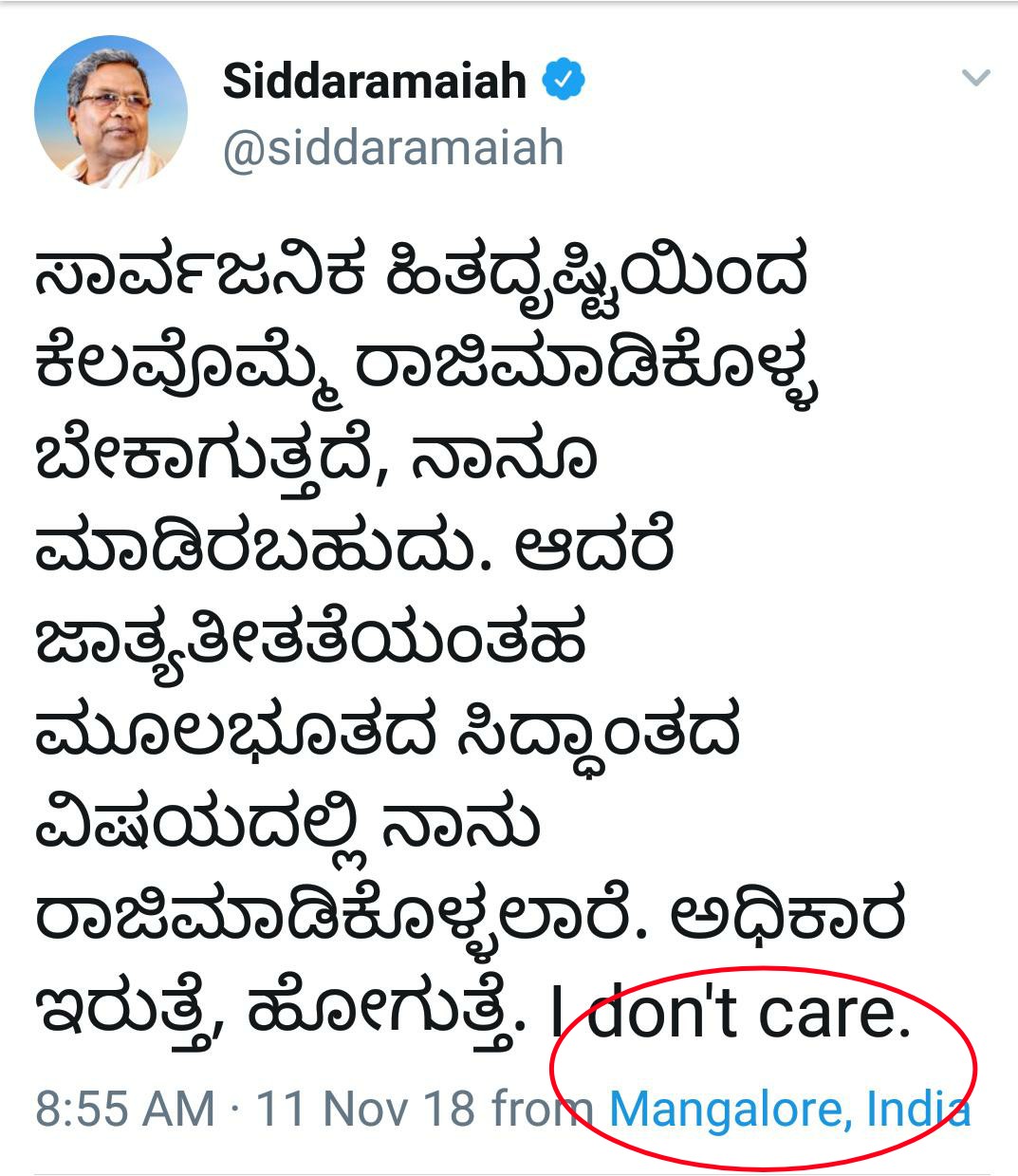 ಬೇಕಾಗುತ್ತದೆ, ನಾನೂ ಮಾಡಿರಬಹುದು. ಆದರೆ ಜಾತ್ಯತೀತತೆಯಂತಹ ಮೂಲಭೂತದ ಸಿದ್ಧಾಂತದ ವಿಷಯದಲ್ಲಿ ನಾನು ರಾಜಿಮಾಡಿಕೊಳ್ಳಲಾರೆ. ಅಧಿಕಾರ ಇರುತ್ತೆ, ಹೋಗುತ್ತೆ. I don't care.— Siddaramaiah (@siddaramaiah) November 11, 2018