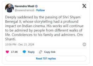 ಎಕ್ಸ್ ಖಾತೆಯಲ್ಲಿ ಟ್ವೀಟ್ ಮಾಡಿರುವ ಪ್ರಧಾನಿ ಮೋದಿ ‘ಭಾರತೀಯ ಚಿತ್ರರಂಗದ ಮೇಲೆ ಆಳವಾದ ಪ್ರಭಾವ ಬೀರಿದ ಕಥೆ ಹೇಳುವ ಶ್ಯಾಮ್ ಬೆನಗಲ್ ಜಿ ಅವರ ನಿಧನದಿಂದ ತೀವ್ರ ದುಃಖಿತನಾಗಿದ್ದೇನೆ.