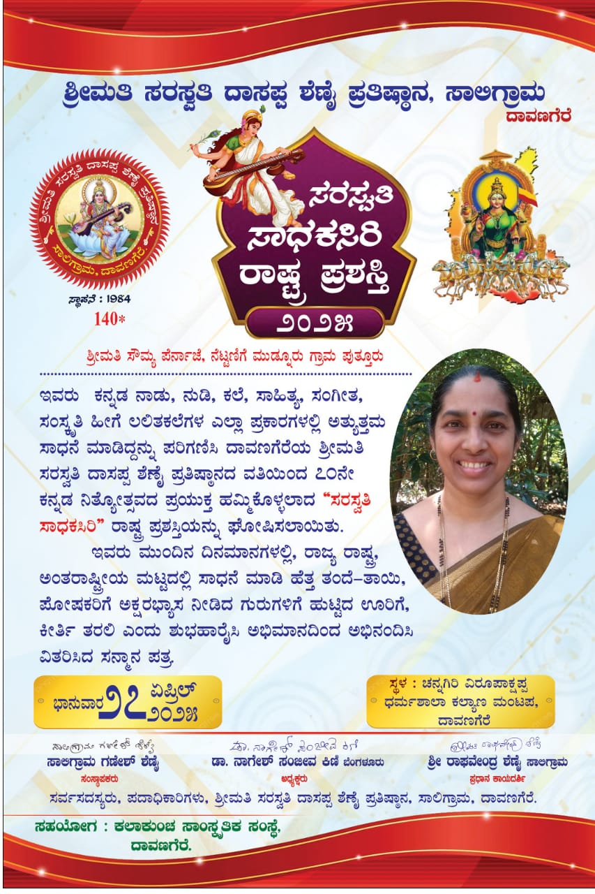ದಾವಣಗೆರೆಯಲ್ಲಿ ಕಲಾ ನಿರ್ದೇಶಕರಾದ ಕುಮಾರ್ ಪೆರ್ನಾಜೆ ಸಹಿತ “ಸ್ವರ ಸಿಂಚನ” ಕಲಾ ತಂಡದ ವಿಶೇಷ ಬರಹಗಾರಕ್ಕೆ ಸೌಮ್ಯ ಪೆರ್ನಾಜೆ ಸಂಗೀತಕ್ಕೆ ಸವಿತಾ ಕೊಡಂದೂರು ಅವರಿಗೆ “ಸರಸ್ವತಿ ಸಾಧಕ ಸಿರಿ “ರಾಷ್ಟ್ರ ಪ್ರಶಸ್ತಿಗೆ ಆಯ್ಕೆ- ಕಹಳೆ ನ್ಯೂಸ್