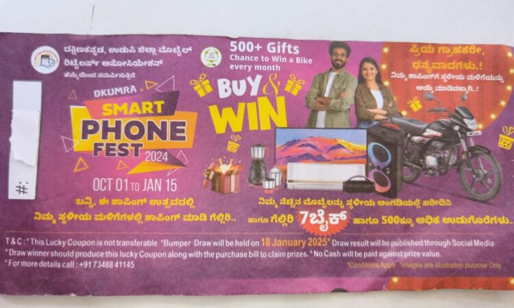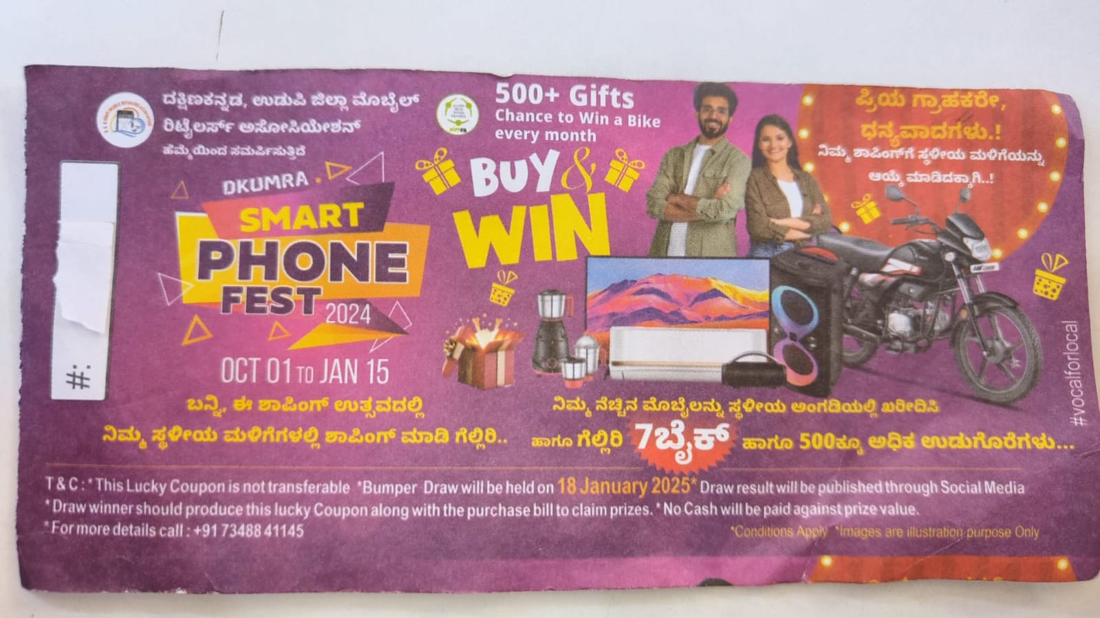 ಉಪ್ಪಿನಂಗಡಿ ಯ ಪ್ರತಿಷ್ಟಿತ ಹಾಗೂ ಜನಪ್ರಿಯ ಮೊಬೈಲ್ ಮಳಿಗೆ ‘ಶ್ರೀನಿಧಿ ಮೊಬೈಲ್ಸ್’ ಗೆ ಈ ವರ್ಷ ದಕ್ಷಿಣ ಕನ್ನಡ & ಉಡುಪಿ ಮೊಬೈಲ್ ಅಶೋಷಿಯೇಶನ್ ಹಮ್ಮಿಕೊಂಡಿದ್ದ ಸ್ಮಾರ್ಟ್ ಫೋನ್ ಫೆಸ್ಟ್ ಲಕ್ಕಿ ಕೂಪನ್ನಲ್ಲಿ 4 ಬಹುಮಾನಗಳು ಬಂದಿದ್ದು ಶ್ರೀನಿಧಿಯ ಗ್ರಾಹಕರಿಗೆ ಸಂತಸ ತಂದಿದೆ, ಗ್ರಾಹಕರಿಗೆ ರೂ 1000 ಕ್ಕಿಂತ ಹೆಚ್ಚಿನ ಪ್ರತೀ ಖರೀದಿಗೂ ಒಂದು ಉಚಿತ ಲಕ್ಕಿ ಕೂಪನ್ ನೀಡಲಾಗುತಿತ್ತು.