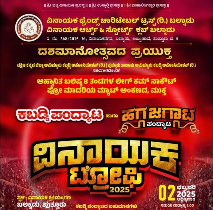 ಪುತ್ತೂರು : ವಿನಾಯಕ ಫ್ರೆಂಡ್ಸ್ ಚಾರಿಟೇಬಲ್ ಟ್ರಸ್ಟ್ (ರಿ.) ಬಲ್ನಾಡು, ಮತ್ತು ದುರ್ಗಾಶ್ರೀ ಭಜನ ಮಂಡಳಿ ಬಲ್ನಾಡು ಕಾಟುಕುಕ್ಕೆ ಭಜನ ಚಾರಿಟೇಬಲ್ ಟ್ರಸ್ಟ್ ರಿ. ಬಲ್ನಾಡು ಇದರ ದಶಮಹೋತ್ಸವದ ಪ್ರಯುಕ್ತ ದಕ್ಷಿಣ ಕನ್ನಡದ ವಿವಿಧ ಬಲಿಷ್ಠ ತಂಡಗಳ ಪ್ರೋ ಮಾದರಿಯ ಕಬಡ್ಡಿ ಪಂದ್ಯಾಟ, ವಿವಿಧ ಭಜನಾ ಮಂಡಳಿಯವರಿಂದ ಭಜನೋತ್ಸವ, ಹಾಗೂ ಗ್ರೀಪ್ ಮಾದರಿಯ ಹಗ್ಗಜಗ್ಗಾಟ ಪಂದ್ಯಾಟವು ಫೆ.02ರಂದು ಬಲ್ನಾಡಿನ ವಿನಾಯಕ ಕ್ರೀಡಾಂಗಣದಲ್ಲಿ ನಡೆಯಲಿದೆ.