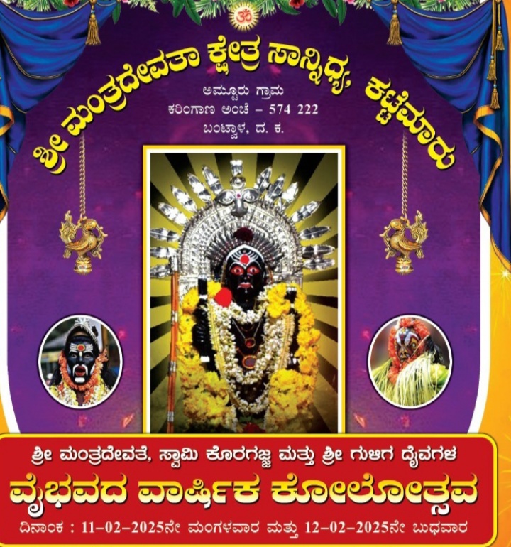 ಬಂಟ್ವಾಳ : ಬಂಟ್ವಾಳ ತಾಲೂಕಿನ ಶ್ರೀ ಮಂತ್ರ ದೇವತಾ ಕ್ಷೇತ್ರ ಸಾನಿದ್ಯ ಕಟ್ಟೆಮಾರು ಶ್ರೀ ಮಂತ್ರ ದೇವತೆ, ಸ್ವಾಮಿ ಕೊರಗಜ್ಜ ಮತ್ತು ಶ್ರೀ ಗುಳಿಗ ದೈವಗಳ ವೈಭವದ ವಾರ್ಷಿಕ ಕೋಲೋತ್ಸವ ಕಾರ್ಯಕ್ರಮವು ದಿನಾಂಕ 11 ರಂದು ಮಂಗಳವಾರ ದಿಂದ 13 ರಂದು ಗುರುವಾರ ತನಕ ನಡೆಯಲಿರುವುದು.