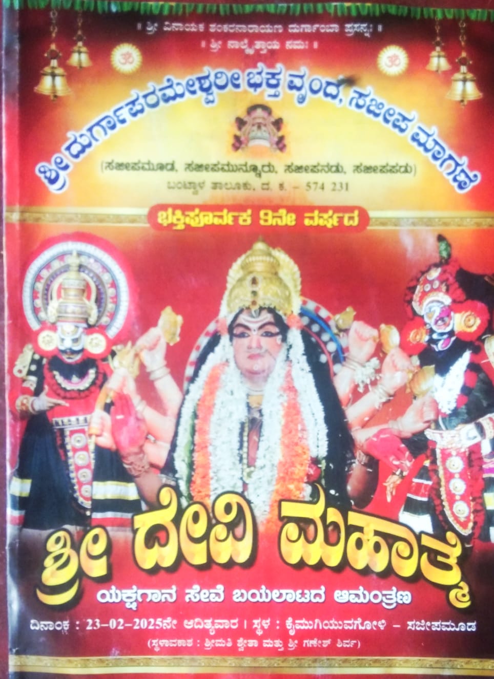 ಬಂಟ್ವಾಳ : ಸಜೀಪ ಮೂಡ,ಸಜೀಪ ಮುನ್ನೂರು,ಸಜೀಪನಡು,ಸಜೀಪಪಡು ಗ್ರಾಮಗಳನ್ನು ಒಳಗೊಂಡ ಶ್ರೀ ದುರ್ಗಾಪರಮೇಶ್ವರಿ ಭಕ್ತ ವೃಂದ,ಸಜಿಪ ಮಾಗಣೆ ವತಿಯಿಂದ ಕಟೀಲು ಶ್ರೀ ದುರ್ಗಾಪರಮೇಶ್ವರಿ ಪ್ರಸಾದಿತ ದಶಾವತಾರ ಯಕ್ಷಗಾನ ಮಂಡಳಿ ಕಟೀಲು ವತಿಯಿಂದ ಸಜೀಪಮೂಡ ಗ್ರಾಮದ ಕೈಮುಗಿಯುವಗೋಳಿ ಎಂಬಲ್ಲಿ ಫೆ. 23 ರಂದು ರವಿವಾರ ಸಂಜೆ 6 ಗಂಟೆಯಿಂದ ಭಕ್ತಿ ಪೂರ್ವಕ 9ನೇ ವರ್ಷದ ಶ್ರೀದೇವಿ ಮಹಾತ್ಮೆ ಎಂಬ ಯಕ್ಷಗಾನ ಬಯಲಾಟ ನಡೆಯಲಿರುವುದು.