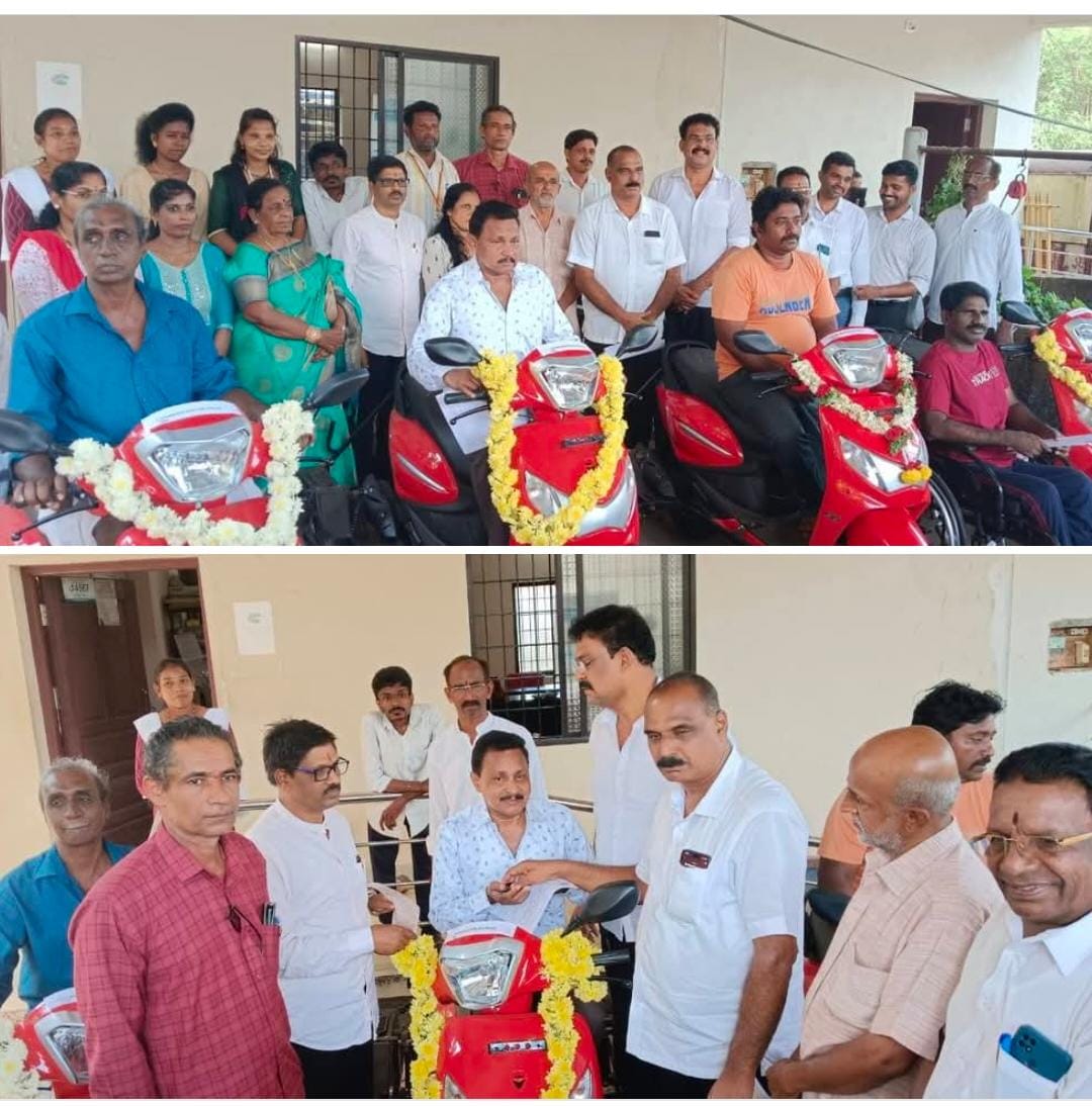 ಕುಂದಾಪುರ: ವಿಕಲಚೇತನರ ಮತ್ತು ಹಿರಿಯ ನಾಗರಿಕರ ಸಬಲೀಕರಣ ಇಲಾಖೆ ಉಡುಪಿ ಜಿಲ್ಲೆ ಜಿಲ್ಲಾ ಖನಿಜ ಪ್ರತಿಷ್ಠಾನ ನಿಧಿಯಿಂದ ಕುಂದಾಪುರ ವಿಧಾನಸಭಾ ಕ್ಷೇತ್ರ ವ್ಯಾಪ್ತಿಯ ತಲ 10 ಜನ ಫಲಾನುಭವಿಗಳಿಗೆ ದ್ವಿಚಕ್ರ ವಾಹನ ವಿತರಿಸುವ ಕಾರ್ಯಕ್ರಮ ಕುಂದಾಪುರದ ವಿಕಲಚೇತನರ ಇಲಾಖೆಯ ಆವರಣದಲ್ಲಿ ಆಯೋಜಿಸಿದ್ದು ಕುಂದಾಪುರ ವಿಧಾನಸಭಾ ಕ್ಷೇತ್ರದ *ಶಾಸಕರಾದ ಎ.ಕಿರಣ್ ಕುಮಾರ್ ಕೊಡ್ಗಿ ಅವರು ಫಲಾನುಭವಿಗಳಿಗೆ ದ್ವಿಚಕ್ರ ವಾಹನ ಕೀಲಿಕೈ ಹಸ್ತಾಂತರಿಸಿ ಶುಭ ಹಾರೈಸಿದರು.