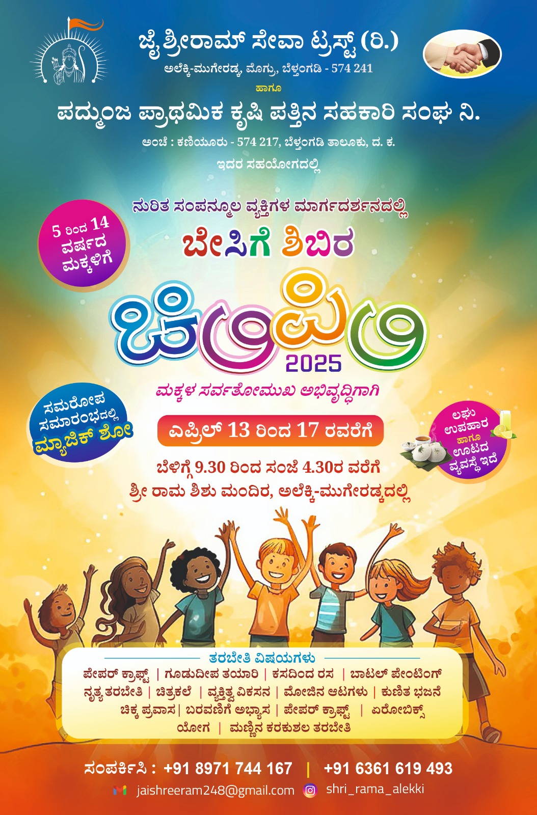 ಮೊಗ್ರು : ಎ. 13 ಮೊಗ್ರು ಗ್ರಾಮದ ಅಲೆಕ್ಕಿ-ಮುಗೇರಡ್ಕ ಜೈ ಶ್ರೀರಾಮ್ ಸೇವಾ ಟ್ರಸ್ಟ್ (ರಿ.) ಹಾಗೂ ಪದ್ಮುಂಜ ಪ್ರಾಥಮಿಕ ಕೃಷಿ ಪತ್ತಿನ ಸಹಕಾರಿ ಸಂಘ ನಿ. ಇದರ ಸಹಯೋಗದಲ್ಲಿ ನುರಿತ ಸಂಪನ್ಮೂಲ ವ್ಯಕ್ತಿಗಳ ಮಾರ್ಗದರ್ಶನದಲ್ಲಿ 5 ರಿಂದ 14 ವರ್ಷಗಳ ಮಕ್ಕಳಿಗೆ ಬೇಸಿಗೆ ಶಿಬಿರ ಚಿಣ್ಣರ ಚಿಲಿಪಿಲಿ 2025 ಕಾರ್ಯಕ್ರಮ ಎಪ್ರಿಲ್ 13 ರಿಂದ 17 ರವರೆಗೆ ನಡೆಯಲಿದೆ.