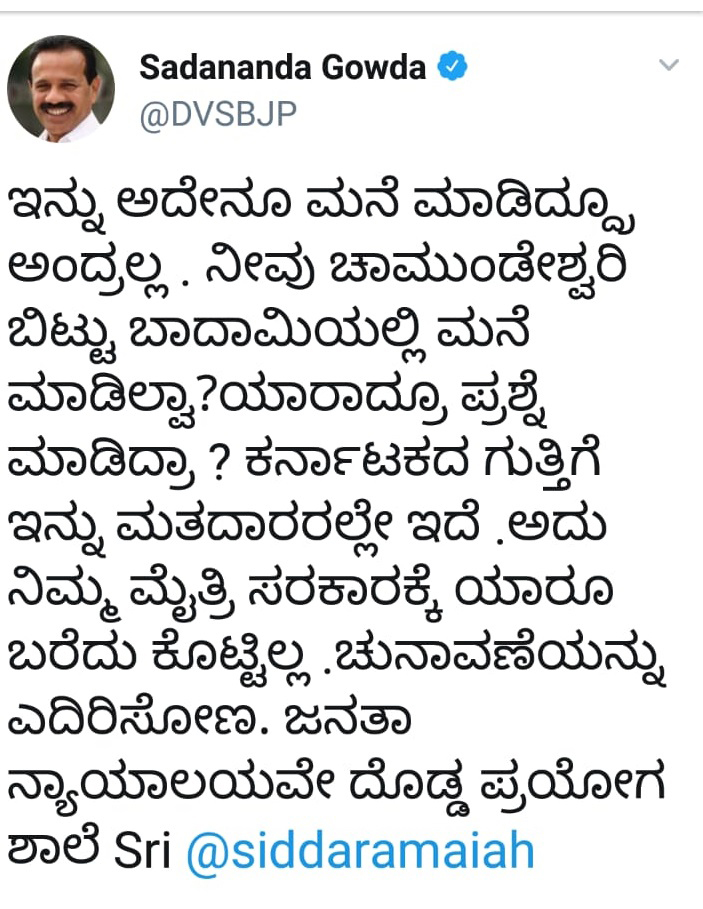 ಇದಕ್ಕೆ ಪ್ರತ್ಯುತ್ತರವಾಗಿ ಕೇಂದ್ರ ಸಚಿವ ಡಿ ವಿ ಎಸ್ ಟ್ವೀಟ್ ಮಾಡಿದ್ದಾರೆ. ಇನ್ನು ‘ಅದೇನೂ ಮನೆ ಮಾಡಿದ್ರೂ ಅಂದ್ರಲ್ಲ. ನೀವು ಚಾಮುಂಡೇಶ್ವರಿ ಬಿಟ್ಟು ಬಾದಾಮಿಯಲ್ಲಿ ಮನೆ ಮಾಡಿಲ್ವಾ? ಯಾರಾದ್ರೂ ಪ್ರಶ್ನೆ ಮಾಡಿದ್ರಾ? ಕರ್ನಾಟಕದ ಗುತ್ತಿಗೆ ಇನ್ನೂ ಕೂಡ ಮತದಾರರ ಕೈಯಲ್ಲೇ ಇದೆ. ಅದು ನಿಮ್ಮ ಮೈತ್ರಿ ಸರ್ಕಾರಕ್ಕೆ ಯಾರೂ ಬರೆದು ಕೊಟ್ಟಿಲ್ಲ. ಚುನಾವಣೆಯನ್ನು ಎದುರಿಸೋಣ. ಆನತಾ ನ್ಯಾಯಾಲಯವೇ ದೊಡ್ಡ ಪ್ರಯೋಗ ಶಾಲೆ’ ಎಂದು ಸಿದ್ದುಗೆ ತಿರುಗೇಟು ನೀಡಿದ್ದಾರೆ.