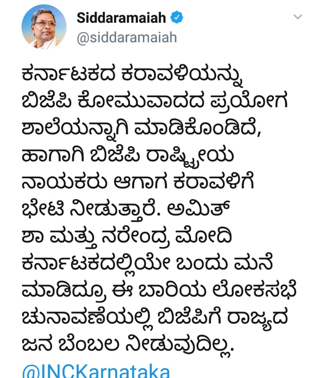 ಕೈ ಕಮಲ ನಾಯಕರ ನಡುವೆ ಟ್ವಿಟ್ಟರ್ನಲ್ಲಿ ಟ್ವೀಟ್ ವಾರ್ ಆಗ್ತಾನೇ ಇದೆ. ನಾಡಿನ ಮಾಜಿ ಸಿ ಎಂ ಸಿದ್ದರಾಮಯ್ಯ ಮಂಗಳೂರಿಗೆ ಅಮಿತ್ ಶಾ ಭೇಟಿ ಬಗ್ಗೆ ತಮ್ಮ ಟ್ವಿಟರ್ ಖಾತೆಯಲ್ಲಿ ಕಿಡಿ ಕಾರಿದ್ದಾರೆ. ‘ಕರ್ನಾಟಕದ ಕರಾವಳಿಯನ್ನು ಬಿಜೆಪಿ ಕೋಮುವಾದದ ಪ್ರಯೋಗ ಶಾಲೆಯನ್ನಾಗಿ ಮಾಡಿಕೊಂಡಿದೆ. ಹಾಗಾಗಿ ಬಿಜೆಪಿ ನಾಯಕರು ಆಗಾಗ ಕರಾವಳಿಗೆ ಭೇಟಿ ನೀಡುತ್ತಾರೆ. ಅಮಿತ್ ಶಾ ಮತ್ತು ನರೇಂದ್ರ ಮೋದಿ ಕರ್ನಾಟಕದಲ್ಲೇ ಬಂದು ಮನೆ ಮಾಡಿದ್ರೂ ಈ ಬಾರಿಯ ಲೋಕಸಭಾ ಚುನಾವಣೆಯಲ್ಲಿ ಬಿಜೆಪಿಗೆ ರಾಜ್ಯದ ಜನ ಬೆಂಬಲ ನೀಡುವುದಿಲ್ಲ’ ಎಂದಿದ್ದಾರೆ.