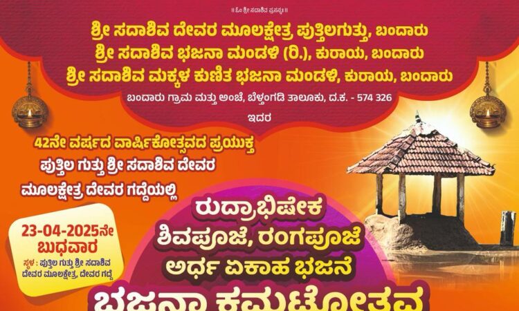 ಬಂದಾರು:”ಶ್ರಿ ಸದಾಶಿವ ದೇವರ ಮೂಲಕ್ಷೇತ್ರ ಪುತ್ತಿಲಗುತ್ತು, ಬಂದಾರು, ಶ್ರೀ ಸದಾಶಿವಾ ಭಜನಾ ಮಂಡಳಿ (ರಿ.),ಕುರಾಯ, ಬಂದಾರು ಶ್ರೀ ಸದಾಶಿವ ಮಕ್ಕಳ ಕುಣಿತ ಭಜನಾ ಮಂಡಳಿ,ಕುರಾಯ,ಬಂದಾರು ಇವರ 42ನೇ ವರ್ಷದ ವಾರ್ಷಿಕೋತ್ಸವದ ಪ್ರಯುಕ್ತ ಏ.23 ರಂದು ಪುತ್ತಿಲ ಗುತ್ತು ಶ್ರೀ ಸದಾಶಿವ ದೇವರ ಮೂಲಕ್ಷೇತ್ರ ದೇವರ ಗದ್ದೆಯಲ್ಲಿ ರುದ್ರಾಭಿಷೇಕ ಶಿವಪೂಜೆ, ರಂಗಪೂಜೆ ಅರ್ಧಏಕಾಹ ಭಜನೆ ,ಭಜನಾ ಕಮ್ಮಟೋತ್ಸವ ಮತ್ತು ನಾಗದೇವರ ಹಾಗೂ ಪಂಜುರ್ಲಿದೈವದ ಶಿಲಾ ಪ್ರತಿಷ್ಠೆ ನಡೆಯಲಿದೆ.
