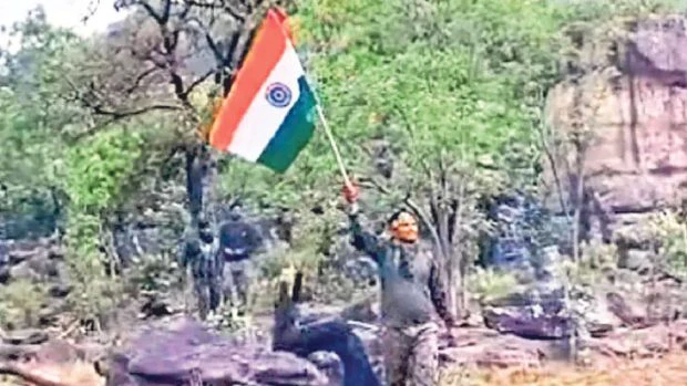 ರಾಯ್ಪುರ: ಛತ್ತೀಸ್ಗಢ ಹಾಗೂ ತೆಲಂಗಾಣ ಗಡಿಯಲ್ಲಿ ನಡೆಯುತ್ತಿರುವ ದೇಶದ ಅತೀದೊಡ್ಡ ನಕ್ಸಲ್ ನಿಗ್ರಹ ಕಾರ್ಯಾಚರಣೆ ‘ಆಪರೇಷನ್ ಕಾಗರ್’ ಭಾಗವಾಗಿ ಭದ್ರತಾಪಡೆಗಳು ಕರೇಗುಡ್ಡವನ್ನು ನಕ್ಸಲ್ ಮುಕ್ತಗೊಳಿಸಿದೆ. ಕಾಪ್ಟರ್ಗಳ ಸಹಾಯದಿಂದ ಕರೇಗುಡ್ಡದ ದಟ್ಟಾರಣ್ಯದೊಳಗೆ ಇಳಿದ ಭದ್ರತಾ ಸಿಬಂದಿ ಗುಡ್ಡ ವಶಕ್ಕೆ ಪಡೆದು ತ್ರಿವರ್ಣ ಧ್ವಜ ಹಾರಿಸಿ ಸಂಭ್ರಮಿಸಿದ್ದಾರೆ.