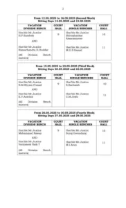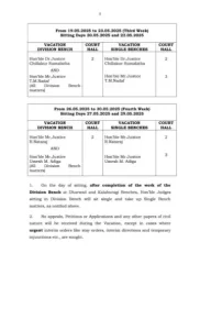 ರಜೆ ಅವಧಿಯಲ್ಲಿ ತುರ್ತು ಅರ್ಜಿಗಳ ವಿಚಾರಣೆಗೆ ಬೆಂಗಳೂರಿನ ಪ್ರಧಾನ ಪೀಠ, ಧಾರವಾಡ ಮತ್ತು ಕಲಬುರಗಿ ಪೀಠಗಳಲ್ಲಿ ಮೇ 6, 8, 13, 15, 20, 22, 27 ಮತ್ತು 29ರಂದು ರಜಾಕಾಲದ ಪೀಠಗಳು ಕಾರ್ಯ ನಿರ್ವಹಿಸಲಿವೆ.