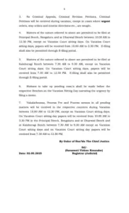 ರಜೆ ಅವಧಿಯಲ್ಲಿ ಬೆಂಗಳೂರು ಮತ್ತು ಧಾರವಾಡ ಪೀಠಗಳು ಬೆಳಗ್ಗೆ 10.30ರಿಂದ ಕಲಾಪ ಆರಂಭಿಸಿದರೆ, ಕಲಬುರಗಿ ಪೀಠ ಬೆಳಿಗ್ಗೆ 8ಕ್ಕೆ ಕಾರ್ಯಾರಂಭಗೊಳ್ಳಲಿದೆ. ಈ ಅವಧಿಯಲ್ಲಿ ಕಾರ್ಯ ನಿರ್ವಹಿಸುವ ರಜಾಪೀಠಗಳಿಗೆ ನ್ಯಾಯಮೂರ್ತಿಗಳನ್ನು ನಿಯೋಜಿಸಿ ಸಿಜೆ ಸೂಚನೆ ಮೇರೆಗೆ ರಿಜಿಸ್ಟ್ರಾರ್ ಜನರಲ್ ಆದೇಶ ಹೊರಡಿಸಿದ್ದಾರೆ.