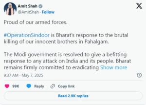 ಆಪರೇಷನ್ ಸಿಂಧೂರ : “ನಮ್ಮ ಸಶಸ್ತ್ರ ಪಡೆಗಳ ಬಗ್ಗೆ ಹೆಮ್ಮೆಯಿದೆ” ಸೇನಾಪಡೆಗಳ ಕಾರ್ಯಕ್ಕೆ ಶ್ಲಾಘನೆ ವ್ಯಕ್ತಪಡಿಸಿದ ಕೇಂದ್ರ ಗೃಹಸಚಿವ ಅಮಿತ್ ಶಾ