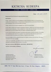 ಪಹಲ್ಗಾಮ್ ಭಯೋತ್ಪಾದಕ ದಾಳಿಗೆ ಪ್ರತೀಕಾರವಾಗಿ ಭಾರತ ನಡೆಸುತ್ತಿರುವ ‘ಆಪರೇಷನ್ ಸಿಂಧೂರ’ ಕಾರ್ಯಾಚರಣೆ ಮೆಚ್ಚಿ ಪ್ರಧಾನಿ ನರೇಂದ್ರ ಮೋದಿ ಅವರಿಗೆ ನಟ ಕಿಚ್ಚು ಸುದೀಪ್ ಪತ್ರ ಬರೆದಿದ್ದಾರೆ.