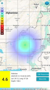 ಇಸ್ಲಾಮಾಬಾದ್, ಮೇ 12: ಭಾರತದ ದಾಳಿಯಿಂದ ಕಂಗೆಟ್ಟಿದ್ದ ಪಾಕಿಸ್ತಾನ ಇದೀಗ ಭೂಕಂಪದಿಂದ ನಲುಗಿದೆ. ರಿಕ್ಟರ್ ಮಾಪಕದಲ್ಲಿ 4.6 ತೀವ್ರತೆ ದಾಖಲಾಗಿದೆ. ರಾಷ್ಟ್ರೀಯ ಭೂಕಂಪಶಾಸ್ತ್ರ ಕೇಂದ್ರದ ಪ್ರಕಾರ, ಭೂಕಂಪದ ಅಕ್ಷಾಂಶ 29.12N ಮತ್ತು ರೇಖಾಂಶ 67.26E ಆಗಿತ್ತು.