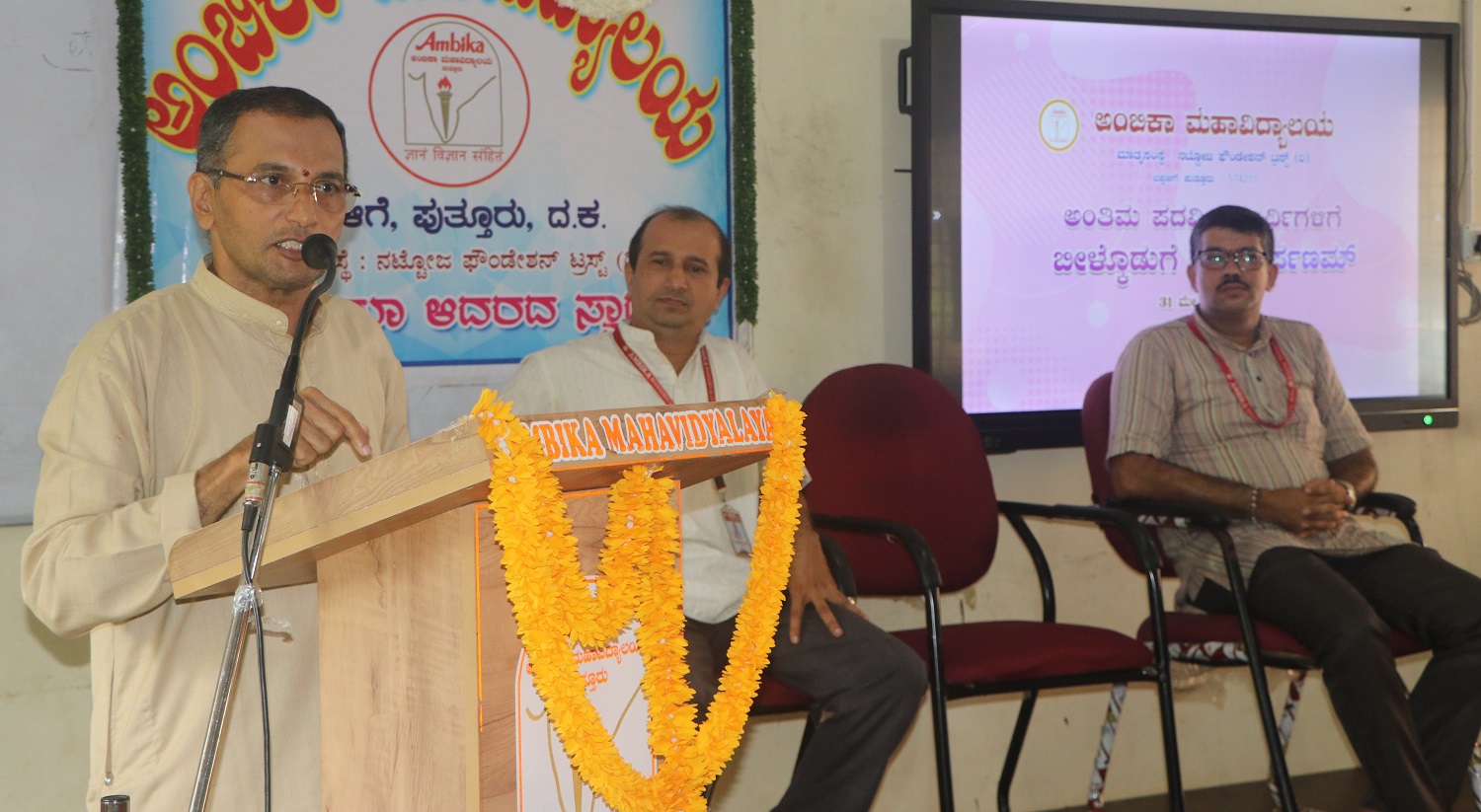 ಪ್ರಸ್ತಾವನೆಗೈದು ಸ್ವಾಗತಿಸಿದ ಅಂಬಿಕಾ ಪದವಿ ಮಹಾವಿದ್ಯಾಲಯದ ಪ್ರಾಚಾರ್ಯ ರಾಕೇಶ ಕುಮಾರ್ ಕಮ್ಮಜೆ ಮೂರು ವರ್ಷಗಳನ್ನು ಒಂದು ಸಂಸ್ಥೆಯಲ್ಲಿ ಕಳೆದು ಹೊರಹೋಗುವುದು ಸಹಜವಾಗಿಯೇ ವಿದ್ಯಾರ್ಥಿಗಳಿಗೆ ಭಾವುಕ ವಿಚಾರ. ಆದರೆ ನಾವು ರೂಪಿಸಿದ ವಿದ್ಯಾರ್ಥಿಗಳನ್ನು ಸಮಾಜಕ್ಕೆ ಸಮರ್ಪಿಸುತ್ತಿದ್ದೇವೆ ಎಂಬುದು ಆಡಳಿತ ಮಂಡಳಿಗೆ ಹಾಗೂ ಉಪನ್ಯಾಸಕರಿಗೆ ಹೆಮ್ಮೆಯ ಸಂಗತಿ. ಸಂಸ್ಥೆಯಲ್ಲಿ ಕಲಿತ ವಷಯಗಳನ್ನು ಬದುಕಿನಲ್ಲಿ ಅಳವಡಿಸಿಕೊಂಡು ಸಾಧನೆಯೆಡೆಗೆ ಹೆಜ್ಜೆ ಹಾಕಬೇಕು ಎಂದು ಕರೆನೀಡಿದರು.