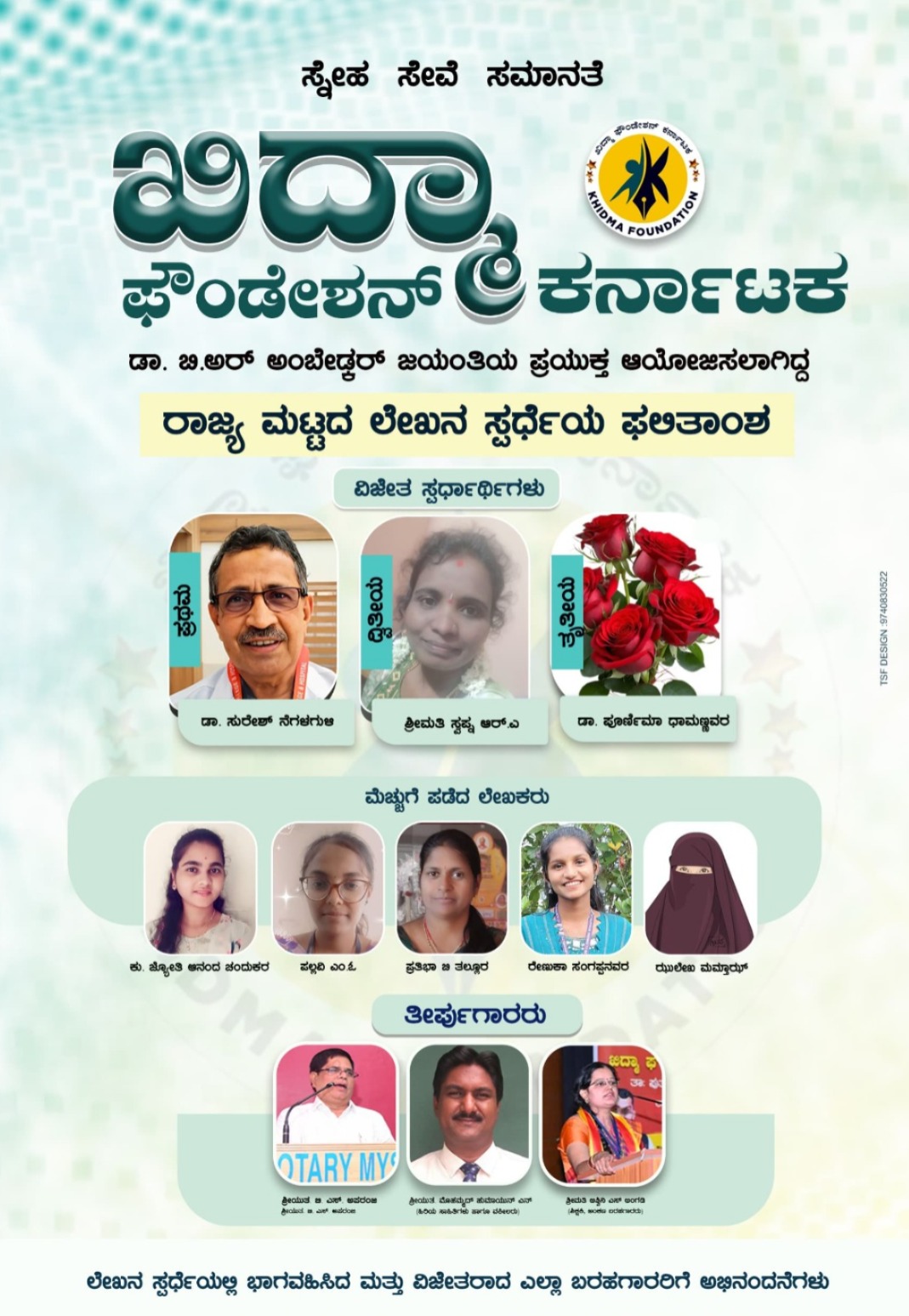 ಸಂವಿಧಾನ ಶಿಲ್ಪಿ ಬಾಬಾಸಾಹೇಬ ಅಂಬೇಡ್ಕರ್ ಅವರ ಜಯಂತಿಯ ಪ್ರಯುಕ್ತ ಖಿದ್ಮಾ ಫೌಂಡೇಶನ್ ಕರ್ನಾಟಕ ಆಯೋಜಿಸಲಾಗಿದ್ದ ರಾಜ್ಯ ಮಟ್ಟದ ಲೇಖನ ಸ್ಪರ್ಧೆಯ ಫಲಿತಾಂಶ ಪ್ರಕಟಣೆಯಾಗಿದೆ. ಪ್ರಥಮ ಹಿರಿಯ ವೈದ್ಯ ಅಧಿಕಾರಿ ಡಾ. ಸುರೇಶ್ ನೆಗಳಗುಳಿ, ದ್ವಿತೀಯ: ಶ್ರೀಮತಿ ಸ್ವಪ್ನ ಆರ್.ಎ ಹಾಗೂ ತೃತೀಯ ಸ್ಥಾನ ಡಾ. ಪೂರ್ಣಿಮಾ ಧಾಮಣ್ಣವರ ಪಡೆದುಕೊಂಡರೆ ತೀರ್ಪುಗಾರರಿಂದ ಝುಲೇಖ ಮಮ್ತಾಝ್, ಕು. ಜ್ಯೋತಿ ಆನಂದ ತಂದುಕೊಂಡರು, ರೇಣುಖಾ ಬಂಗಾರಪ್ಪನವರ, ಪಲ್ಲವಿ ಎಂ.ಓ ಹಾಗೂ ಪ್ರತಿಭಾ ಬಿ ತಲ್ಲೂರ ಅವರು ಮೆಚ್ಚುಗೆಯನ್ನು ಪಡೆದುಕೊಂಡಿದ್ದಾರೆ. ಲೇಖನ ಸ್ಪರ್ಧೆಗೆ ಹಿರಿಯ ಸಾಹಿತಿಗಳು ಹಾಗೂ ವಕೀಲರಾದ ಬಿ. ಎಸ್. ಅಪರಂಜಿ, ಶಿಕ್ಷಕರು, ಲೇಖಕರಾದ ಮೊಹಮ್ಮದ್ ಹುಮಾಯುನ್ ಎನ್ ಹಾಗೂ ಶಿಕ್ಷಕಿ, ಅಂಕಣ ಬರಹಗಾರರಾದ ಅಶ್ವಿನಿ ಎಸ್ ಅಂಗಡಿ ಬಾದಾಮಿ ತೀರ್ಪುಗಾರರಾಗಿ ಕಾರ್ಯನಿರ್ವಹಿಸಿದರು.