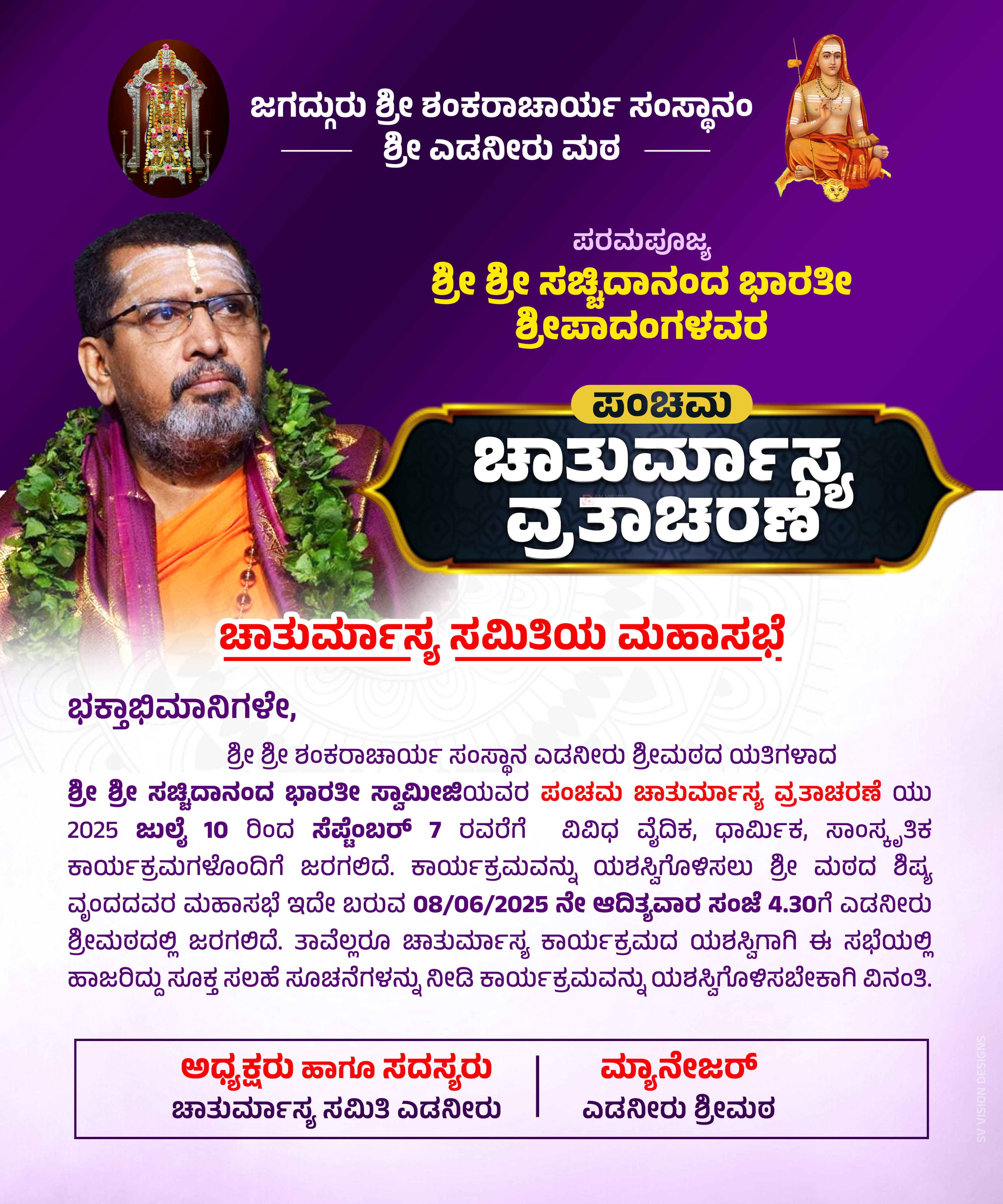 ಪಂಚಮ ಚಾತುರ್ಮಾಸ್ಯ ವ್ರತಾಚರಣೆಯ ಪೂರ್ವಭಾವಿಯಾಗಿ ಚಾತುರ್ಮಾಸ್ಯ ಸಮಿತಿಯ ಮಹಾಸಭೆಯು ಜೂನ್ 08 ರಂದು ಸಂಜೆ 4.30 ಕ್ಕೆ ಶ್ರೀ ಎಡನೀರು ಮಠದಲ್ಲಿ ನಡೆಯಲಿದೆ ಎಂದು ಶ್ರೀಮಠದ ಮ್ಯಾನೇಜರ್ ಹಾಗೂ ಚಾತುರ್ಮಾಸ್ಯ ಸಮಿತಿ ಪ್ರಕಟಣೆಯಲ್ಲಿ ತಿಳಿಸಿದೆ.