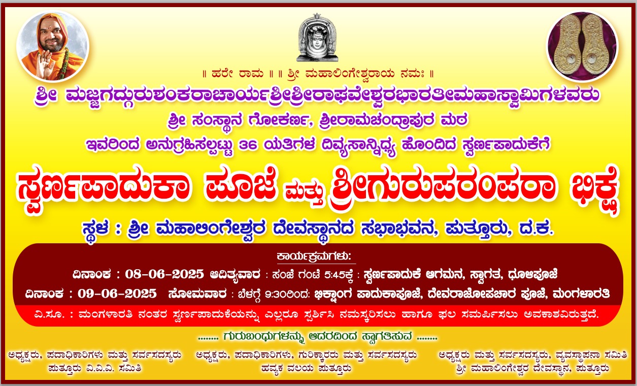 ಜೂ.09ರಂದು ಪುತ್ತೂರು ಮಹಾತೋಭಾರ ಶ್ರೀ ಮಹಾಲಿಂಗೇಶ್ವರ ದೇವಸ್ಥಾನದಲ್ಲಿ ಸ್ವರ್ಣ ಪಾದುಕಾ ಪೂಜೆ ಹಾಗೂ ಶ್ರೀಗುರುಪರಂಪರಾ ಭಿಕ್ಷಾ ಸೇವೆ – ಕಹಳೆ ನ್ಯೂಸ್