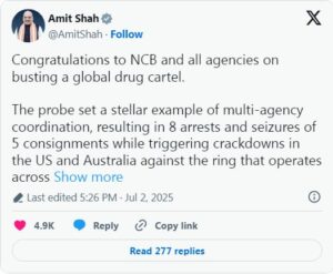 ಜಾಗತಿಕ ಮಾದಕ ದ್ರವ್ಯ ಕಳ್ಳಸಾಗಣೆ ಜಾಲವನ್ನು ಭೇದಿಸಿದ್ದಕ್ಕಾಗಿ ಎನ್ಸಿಬಿ ಮತ್ತು ಎಲ್ಲಾ ಸಂಸ್ಥೆಗಳಿಗೆ ಅಭಿನಂದನೆಗಳು. ತನಿಖೆಯು ಬಹು-ಸಂಸ್ಥೆಗಳ ಸಮನ್ವಯಕ್ಕೆ ಒಂದು ಅದ್ಭುತ ಉದಾಹರಣೆಯನ್ನು ನೀಡಿತು, ಇದರ ಪರಿಣಾಮವಾಗಿ 8 ಮಂದಿಯನ್ನು ಬಂಧಿಸಿ ಮತ್ತು 5 ಸರಕುಗಳನ್ನು ವಶಪಡಿಸಿಕೊಳ್ಳಲಾಯಿತು ಮತ್ತು 4 ಖಂಡಗಳು ಮತ್ತು 10+ ರಾಷ್ಟ್ರಗಳಲ್ಲಿ ಕಾರ್ಯನಿರ್ವಹಿಸುವ ಈ ಜಾಲದ ವಿರುದ್ಧ ಅಮೆರಿಕ ಮತ್ತು ಆಸ್ಟ್ರೇಲಿಯಾದಲ್ಲಿ ಕಠಿಣ ಕ್ರಮ ಕೈಗೊಳ್ಳಲಾಯಿತು.