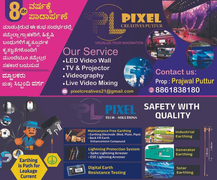 ಪುತ್ತೂರು : ಪುತ್ತೂರಿನಲ್ಲಿ ಸತತವಾಗಿ 7 ವರ್ಷಗಳಿಂದ ಕಾರ್ಯ ನಿರ್ವಹಿಸುತ್ತಿರುವ ಪ್ರಜ್ವಲ್ ಪುತ್ತೂರು ಮಾಲಕತ್ವದ ಪಿಕ್ಸೆಲ್ ಸಂಸ್ಥೆ ಇಂದು ಯಶಸ್ವಿ 8ನೇ ವರ್ಷಕ್ಕೆ ಪಾದಾರ್ಪಣೆ ಗೈಯುತ್ತಿದೆ.
