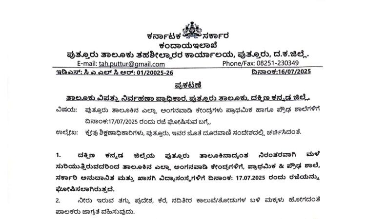 ಪುತ್ತೂರು: ತಾಲೂಕಿನಲ್ಲಿ ನಿರಂತರವಾಗಿ ಸುರಿಯುತ್ತಿರುವ ಭಾರೀ ಮಳೆಯನ್ನು ಗಮನದಲ್ಲಿಟ್ಟುಕೊಂಡು, ಜುಲೈ 17, 2025 ರಂದು ಪುತ್ತೂರು ತಾಲೂಕಿನ ಎಲ್ಲಾ ಅಂಗನವಾಡಿ ಕೇಂದ್ರಗಳು, ಪ್ರಾಥಮಿಕ ಹಾಗೂ ಪ್ರೌಢ ಶಾಲೆಗಳಿಗೆ ರಜೆ ಘೋಷಣೆ ಮಾಡಲಾಗಿದೆ.