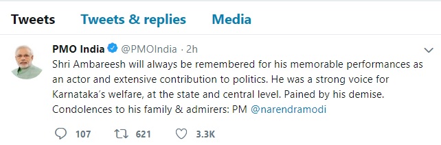 ಸಿನಿಮಾ ಮತ್ತು ರಾಜಕೀಯ ಕ್ಷೇತ್ರದದಲ್ಲಿನ ಅಂಬರೀಶ್ ಕೊಡುಗೆ ಅವಿಸ್ಮರಣೀಯ ಕರ್ನಾಟಕದ ಹಿತಕ್ಕಾಗಿ ರಾಜ್ಯ ಮತ್ತು ಕೇಂದ್ರದ ಮಟ್ಟಿಗೆ ಗಟ್ಟಿ ಧ್ವನಿಯಾಗಿದ್ರು. ಅಂತ ಮೋದಿ ಟ್ವೀಟ್ ಮಾಡುವ ಮೂಲಕ ಸಂತಾಪ ಸೂಚಿಸಿದ್ದಾರೆ.