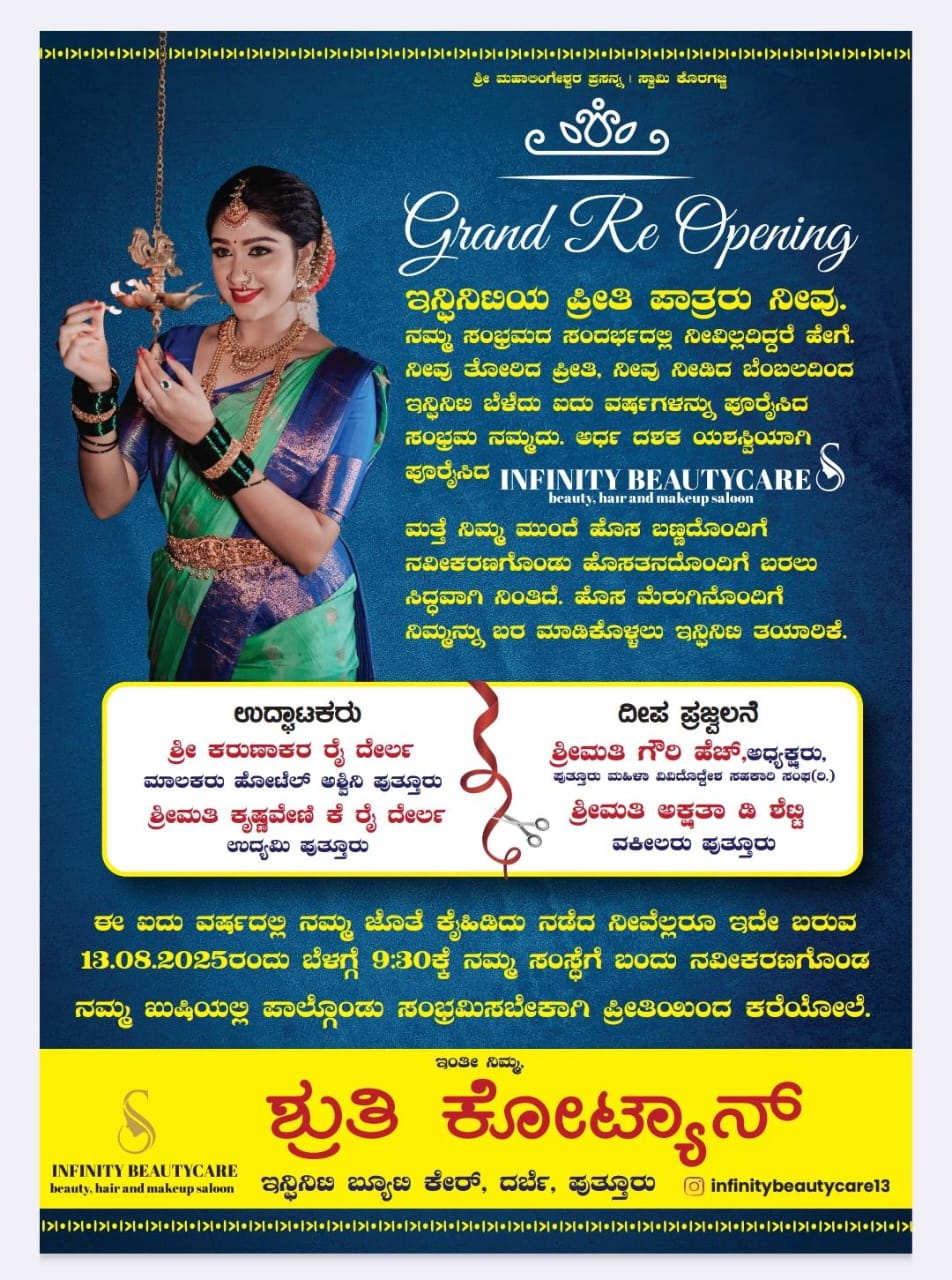 ಪುತ್ತೂರಿನಲ್ಲಿ ಆ.13ರಂದು ಇನ್ಫಿನಿಟಿ ಬ್ಯೂಟಿ ಕೇರ್ ನವೀಕರಣಗೊಂಡು ಶುಭಾರಂಭ -ಕಹಳೆ ನ್ಯೂಸ್