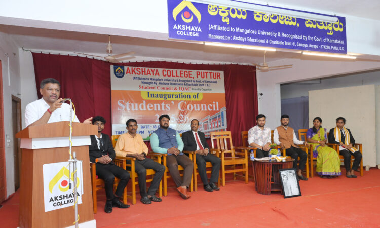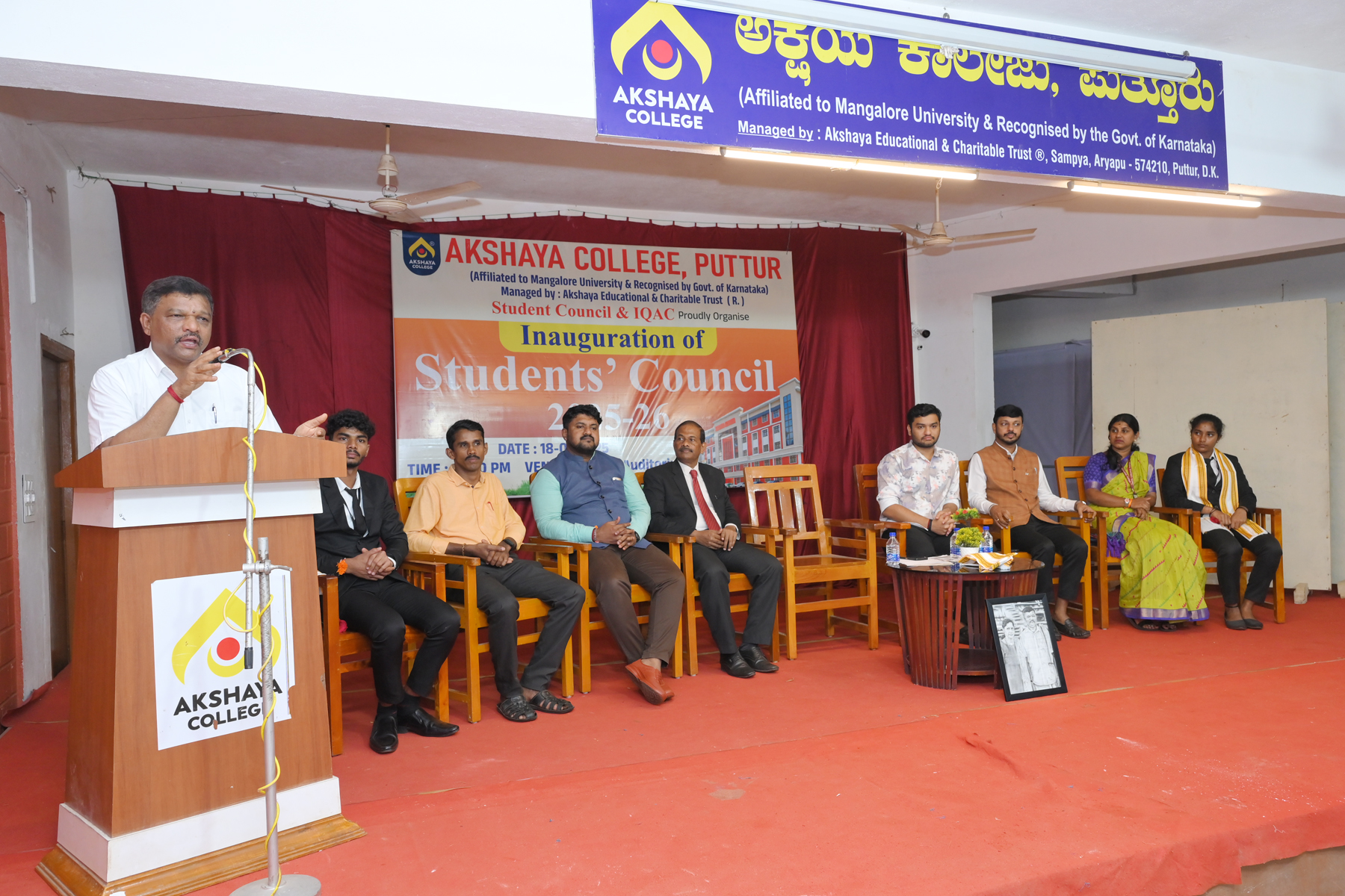 ಕಾರ್ಯಕ್ರಮದ ಅಧ್ಯಕ್ಷತೆ ವಹಿಸಿದ ಕಾಲೇಜಿನ ಅಧ್ಯಕ್ಷರಾದ ಶ್ರೀಯುತ ಜಯಂತ್ ನಡುಬೈಲ್ ವಿದ್ಯಾರ್ಥಿ ಒಕ್ಕೂಟ ವನ್ನು ಉದ್ದೇಶಿಸಿ, ವಿದ್ಯಾರ್ಥಿ ಪ್ರತಿನಿಧಿಗಳು ಸಂಸ್ಥೆಯಲ್ಲಿ ವಿದ್ಯಾರ್ಜನೆ ಮಾಡುವ ಎಲ್ಲಾ ವಿದ್ಯಾರ್ಥಿಗಳಿಗೆ ಸ್ಪಂದಿಸುತ್ತಾ , ವಿದ್ಯಾರ್ಥಿಗಳ ಧ್ವನಿಯಾಗಿರ ಬೇಕು. ವಿದ್ಯಾರ್ಥಿಗಳ ಸಮಸ್ಯೆಗಳನ್ನು ಆಲಿಸುತ್ತಾ, ಬೇಡಿಕೆಗಳನ್ನು ಸಂಬಂಧಪಟ್ಟವರ ಗಮನಕ್ಕೆ ತರಬೇಕು ಆ ಮೂಲಕ ವಿದ್ಯಾರ್ಥಿಗಳ ಮಾನಸಿಕ ಸ್ವಾಸ್ಥ್ಯ, ಉತ್ತಮ ಕಲಿಕಾ ಪರಿಸರ ನಿರ್ಮಾಣಕ್ಕೆ ಪ್ರಮಾಣಿಕವಾಗಿ ಪ್ರಯತ್ನಿಸಬೇಕು ಎಂದು ಸಲಹೆ ನೀಡಿದರು. ಆಡಳಿತ ಮಂಡಳಿಯ ಕಾರ್ಯದರ್ಶಿ ಡಾ ಅಕ್ಷಯ್ವಿ ದ್ಯಾರ್ಥಿ ಪ್ರತಿನಿಧಿಗಳಿಗೆ ಶುಭ ಹಾರೈಸಿ , ಮುಂದಿನ ಶೈಕ್ಷಣಿಕ ಸಾಲಿನಲ್ಲಿ ಅರ್ಥಪೂರ್ಣ ಕಾರ್ಯಕ್ರಮಗಳನ್ನು ಆಯೋಜಿಸಿ , ವಿದ್ಯಾರ್ಥಿಗಳಿಗೆ ನೀಡಿದ ಭರವಸೆ ಗಳನ್ನು ಯಥಾವತ್ತಾಗಿ ಪಾಲಿಸಿ ಆದರ್ಶ