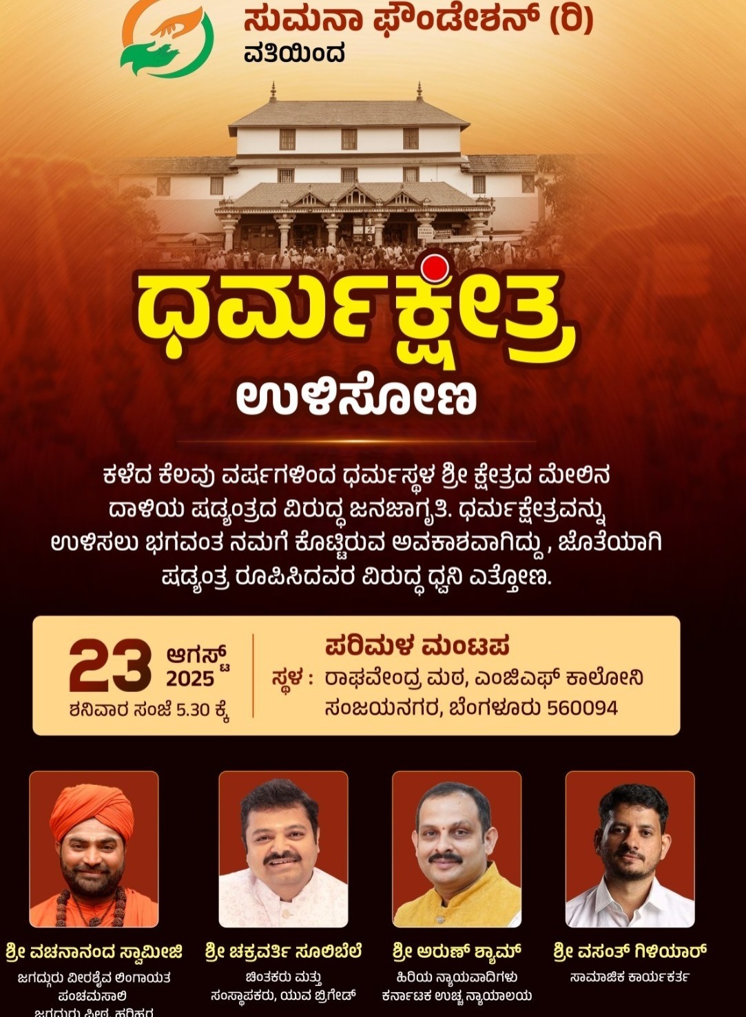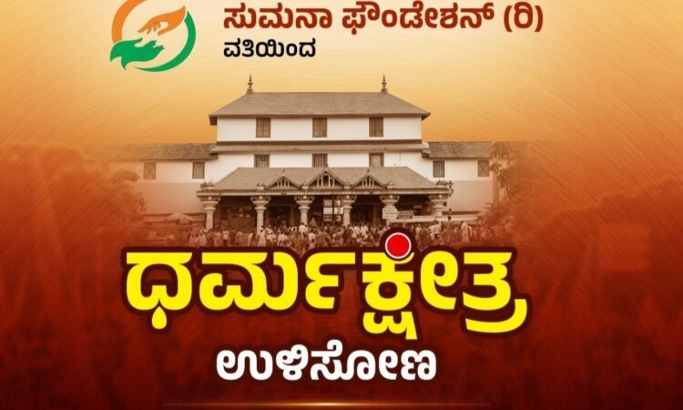 ಬೆಂಗಳೂರು : ಸುಮನಾ ಫೌಂಡೇಶನ್ ರಿ. ವತಿಯಿಂದ ಧರ್ಮ ಕ್ಷೇತ್ರ ಉಳಿಸೋಣ ಎಂಬ ಕಾರ್ಯಕ್ರಮವು ಇದೇ ಬರುವ ಆಗಸ್ಟ್ 23ರಂದು ಸಂಜೆ 5.30ಕ್ಕೆ ಬೆಂಗಳೂರಿನ ಸಂಜಯನಗರದಲ್ಲಿರು ಎಂಜಿಎಫ್ ಕಾಲೋನಿಯ ರಾಘವೇಂದ್ರ ಮಠದ ಪರಿಮಳ ಮಂಟಪದಲ್ಲಿ ನಡೆಯಲಿದೆ.