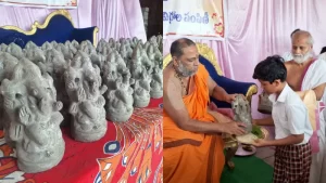 ಮಣ್ಣಿನ ಗಣೇಶ ಮೂರ್ತಿಗಳಿಗೆ ಪೂಜೆ ಸಲ್ಲಿಸಿ, ಮಂಗಳಾರತಿ ಮಾಡಿ ಸಾಂಕೇತಿಕವಾಗಿ ನೂರಾರು ಭಕ್ತರಿಗೆ ಮಣ್ಣಿನ ಗಣೇಶ ಮೂರ್ತಿಗಳನ್ನ ವಿತರಿಸಿದರು. ಪ್ರತಿಯೊಬ್ಬರು ಮಣ್ಣಿನ ಗಣೇಶ ಮೂರ್ತಿಯನ್ನೇ ಪ್ರತಿಷ್ಠಾಪಿಸಿ ಪೂಜಿಸುವಂತೆ ಹೇಳಿದರು.