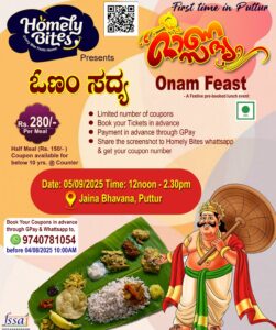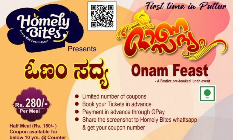 ತಿರುವೊಣಂ ದಿನ ಸೆಪ್ಟೆಂಬರ್ 5 , ಶುಕ್ರವಾರದಂದು,ಪುತ್ತೂರಿನ ಜೈನ ಭವನದಲ್ಲಿ ಓಣಂ ಸದ್ಯ ಮಧ್ಯಾಹ್ನ 12 ರಿಂದ 2:30 ಮುಂಗಡ ಬುಕ್ಕಿಂಗ್ ಮೂಲಕ ಊಟದ ವ್ಯವಸ್ಥೆ ಆಯೋಜಿಸಲಾಗಿದ್ದು, homelybites.co.in ಎಂಬ ವೆಬ್ಸೈಟ್ ,ಫೇಸ್ಬುಕ್ ಪೇಜ್ ಅಥವಾ ನೇರವಾಗಿ 9740781054 ಎಂಬ ವಾಟ್ಸಾಪ್ ಮೂಲಕ ಕಾದಿರಿಸಿ.