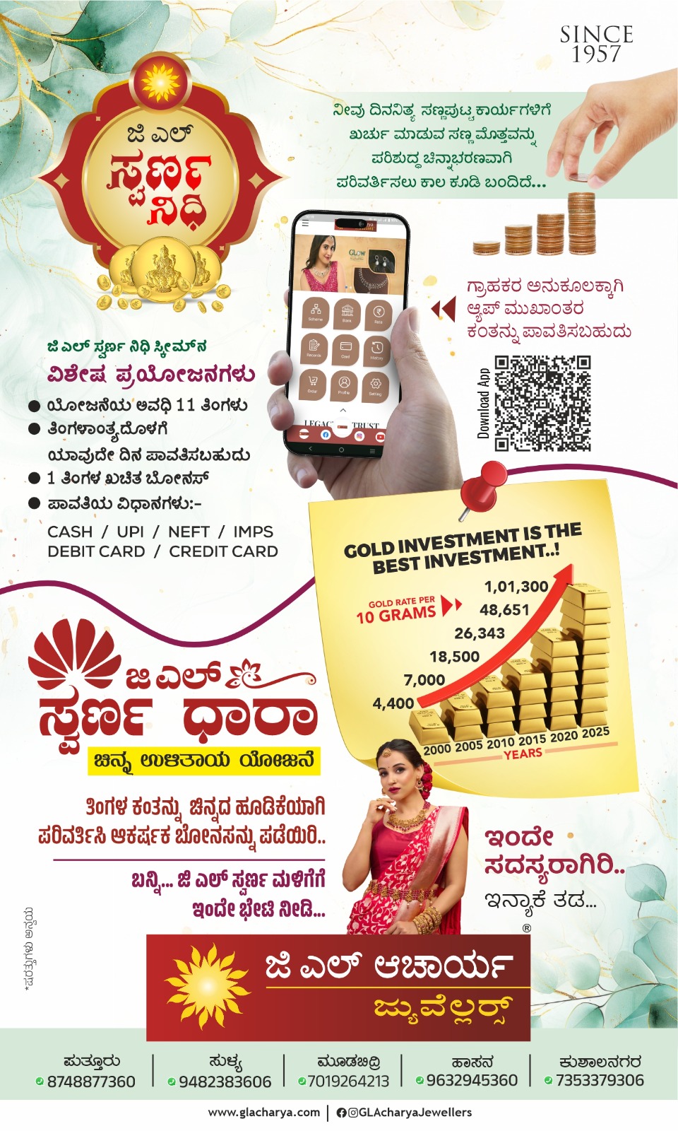 ಪುತ್ತೂರು : ನೀವು ದಿನನಿತ್ಯ ಸಣ್ಣಪುಟ್ಟ ಕಾರ್ಯಗಳಿಗೆ ಖರ್ಚು ಮಾಡುವ ಸಣ್ಣ ಮೊತ್ತವನ್ನು ಪರಿಶುದ್ದ ಚಿನ್ನಾಭರಣವಾಗಿ ಪರಿವರ್ತಿಸಲು ಕಾಲ ಕೂಡಿ ಬಂದಿದೆ. ಅದು ಹೇಗೆ ಅಂತ ಯೋಚಿಸ್ತಿದ್ದೀರಾ..! ಇಲ್ಲಿದೆ ನೋಡಿ.. ನಮ್ಮ ಪುತ್ತೂರಿನ ಪ್ರತಿಷ್ಠಿತ ಚಿನ್ನಾಭರಣಗಳ ಮಳಿಗೆ ಜಿ ಎಲ್ ಆಚಾರ್ಯ ಜ್ಯುವೆಲ್ಲರ್ಸ್ ನಿಮಗಾಗಿ ತಂದಿದೆ “ಜಿ.ಎಲ್. ಸ್ವರ್ಣ ಧಾರಾ” ನಿಮ್ಮ ತಿಂಗಳ ಕಂತನ್ನು ಚಿನ್ನದ ಹೂಡಿಕೆಯಾಗಿ ಪರಿವರ್ತಿಸಿ ಆಕರ್ಷಕ ಬೋನಸನ್ನು ಪಡೆಯಬಹುದಾದ ವಿಶೇಷ ಯೋಜನೆ ಇಂದೇ ಭೇಟಿ “ಜಿ ಎಲ್ ಸ್ವರ್ಣ ನಿಧಿ ಸ್ಟೀಮ್ ನಲ್ಲಿ ನೀಡಿ ಹೂಡಿಕೆ ಮಾಡಿ..