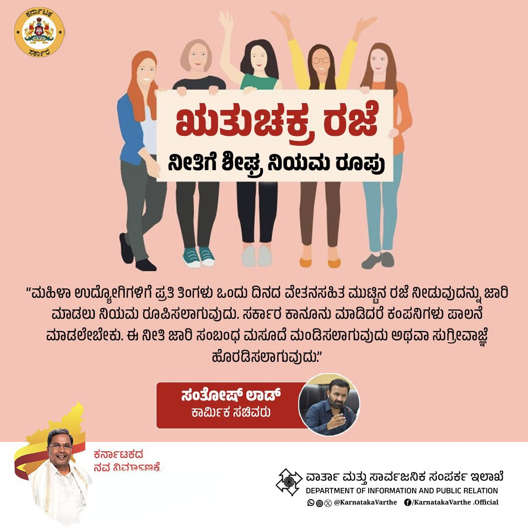 ಈ ಕುರಿತಂತೆ ಕಾರ್ಮಿಕ ಸಚಿವ ಸಂತೋಷ್ ಲಾಡ್ ಮಾಹಿತಿ ನೀಡಿದ್ದು, ಮಹಿಳಾ ಉದ್ಯೋಗಿಗಳಿಗೆ ಪ್ರತಿ ತಿಂಗಳು ಒಂದು ದಿನದ ವೇತನ ಸಹಿತ ಮುಟ್ಟಿನ ರಜೆ ನೀಡುವುದನ್ನು ಜಾರಿ ಮಾಡಲು ನಿಯಮ ರೂಪಿಸಲಾಗುವುದು.
