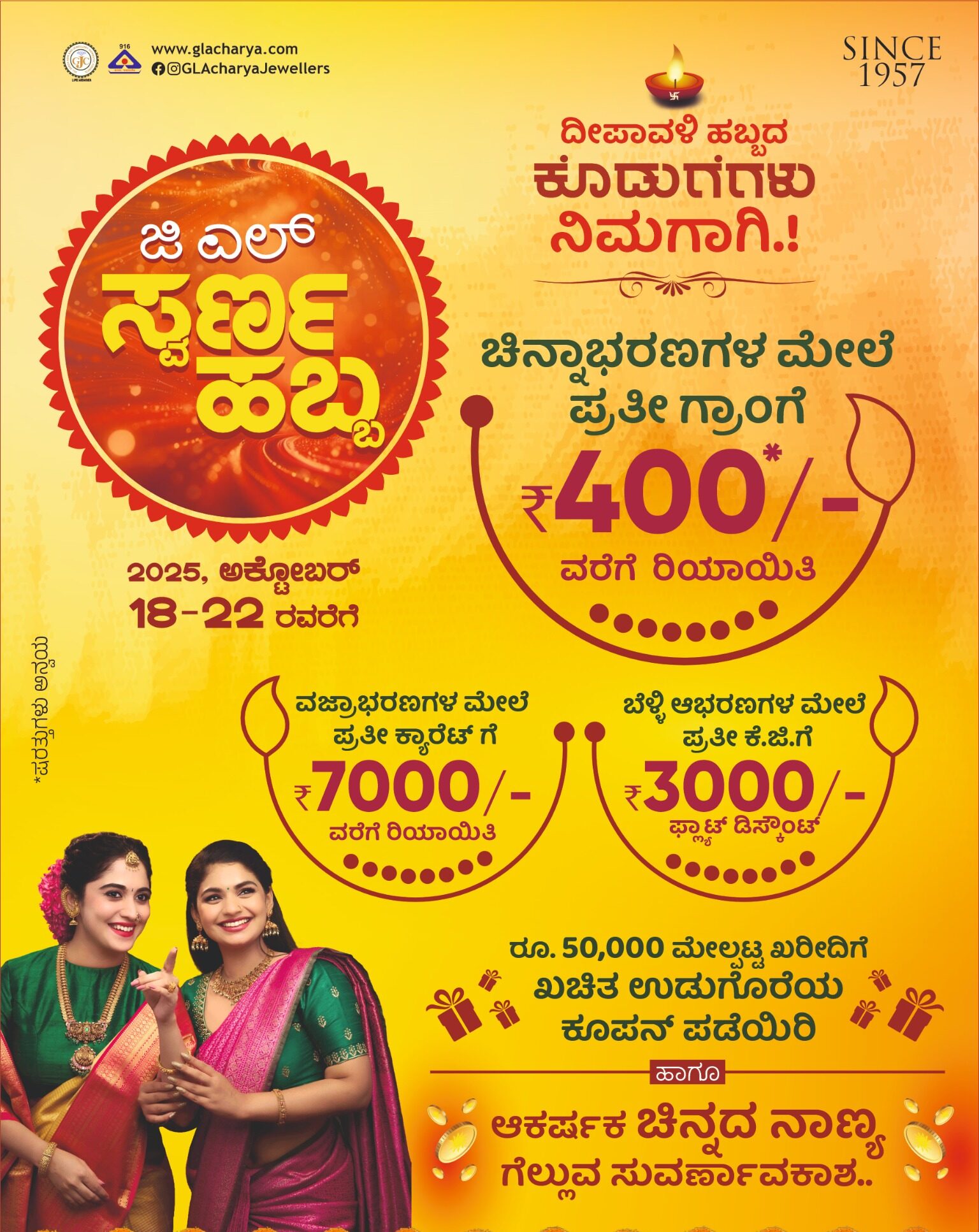 ಪುತ್ತೂರಿನ ಮುಖ್ಯರಸ್ತೆಯ ಪ್ರತಿಷ್ಟಿತ ಚಿನ್ನಾಭರಣಗಳ ಮಳಿಗೆ ಜಿ.ಎಲ್. ಆಚಾರ್ಯ ಜ್ಯುವೆಲ್ಲರ್ಸ್ನಲ್ಲಿ ದೀಪಾವಳಿ ಹಬ್ಬದ ಪ್ರಯುಕ್ತ ಜಿ.ಎಲ್. ಸ್ವರ್ಣ ಹಬ್ಬ ತಾ.18.10.2025 ರಿಂದ 22.10.2025ರ ವರೆಗೆ ನಡೆಯಲಿರುವುದು. ಗ್ರಾಹಕರಿಗೆ ದೀಪಾವಳಿ ಹಬ್ಬದ ಈ ಸಂದರ್ಭದಲ್ಲಿ ಸ್ವರ್ಣ ಹಬ್ಬದ ಪ್ರಯುಕ್ತ ಆಕರ್ಷಕ ಕೊಡುಗೆಗಳನ್ನು ಸಂಸ್ಥೆಯು ಪ್ರಕಟಿಸಿದೆ. ವಜ್ರದ ಆಭರಣಗಳು, ಚಿನ್ನದ ಆಭರಣಗಳು ಹಾಗೂ ಬೆಳ್ಳಿಯ ಆಭರಣಗಳ ಅದ್ಭುತ ರಿಯಾಯಿತಿಗಳನ್ನು ನೀಡಲಾಗಿದೆ.