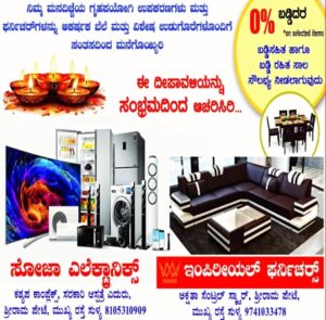 ಆಯ್ದ ವಸ್ತುಗಳ ಮೇಲೆ ಬಡ್ಡಿ ಸಹಿತ ಹಾಗೂ ಬಡ್ಡಿ ರಹಿತ ಸಾಲ ಸೌಲಭ್ಯದ ಜೊತೆಗೆ 0% ಬಡ್ಡಿದರ ನೀಡಲಾಗುವುದು. ಈ ವರ್ಷದ ದೀಪಾವಳಿಯನ್ನು ಸಂಭ್ರಮದಿAದ ಆಚರಿಸಿರಿ ನಿಮ್ಮ ಸೋಜಾ ಎಲೆಕ್ಟ್ರಾನಿಕ್ಸ್ ಕಶ್ಯಪ ಕಾಂಪ್ಲೆಕ್ಸ್, ಸರಕಾರಿ ಆಸ್ಪತ್ರೆ ಎದುರು, ಶ್ರೀರಾಮ ಪೇಟೆ, ಮುಖ್ಯ ರಸ್ತೆ ಸುಳ್ಯ 8105310909 ಹಾಗೂ ಇಂಪಿರೀಯಲ್ ಫರ್ನಿಚರ್ಸ್ ಅಕ್ಷತಾ ಸೆಂಟ್ರಲ್ ಸ್ಟಾರ್, ಶ್ರೀರಾಮ ಪೇಟೆ, ಮುಖ್ಯ ರಸ್ತೆ ಸುಳ್ಯ 9741033478