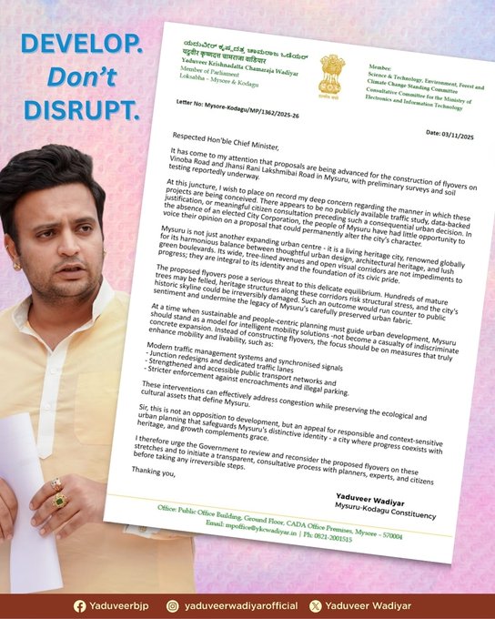 ಎಕ್ಸ್ನಲ್ಲಿ ಪೋಸ್ಟ್ವೊಂದನ್ನು ಹಂಚಿಕೊಂಡಿರುವ ಅವರು, ಜೆಎಲ್ಬಿ ರಸ್ತೆ, ವಿನೋಬಾ ರಸ್ತೆಗಳು ಪಾರಂಪರಿಕ ರಸ್ತೆಗಳಾಗಿವೆ. ಈ ರಸ್ತೆಗಳನ್ನು ಹಾಗೆಯೇ ಉಳಿಸಿಕೊಳ್ಳಬೇಕು. ಜನಾಭಿಪ್ರಾಯ ಪಡೆಯದೇ ಈ ಮಾರ್ಗದಲ್ಲಿ ಫ್ಲೈಓವರ್ ನಿರ್ಮಾಣ ಕಾರ್ಯಕ್ಕೆ ಮುಂದಾಗಿದ್ದಾರೆ. ಡಿಪಿಆರ್ ಕೂಡ ಸಿದ್ಧಪಡಿಸುತ್ತಿದ್ದಾರೆ. ಇದಕ್ಕೆ ನಮ್ಮ ತೀವ್ರ ವಿರೋಧವಿದೆ ಎಂದಿದ್ದಾರೆ