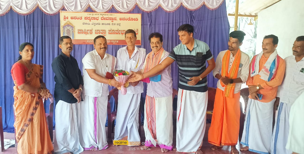 ಇದೇ ಬರುವ ಡಿಸೆಂಬರ್ 24 ,25 ರಂದು ಶ್ರೀ ಅನಂತಪದ್ಮನಾಭ ದೇವಸ್ಥಾನ ಇದರ ವಾರ್ಷಿಕ ಜಾತ್ರೆ ಹಾಗೂ ಪರಿವಾರದ ದೈವಗಳ ನರ್ತನ ಸೇವೆ ಮತ್ತು ಸಾಂಸ್ಕೃತಿಕ ಕಾರ್ಯಕ್ರಮ ನಡೆಯಲಿದ್ದು ಈ ಬಗ್ಗೆ ನಡೆದ ಪೂರ್ವಭಾವಿ ಸಭೆಯಲ್ಲಿ ಆಮಂತ್ರಣ ಪತ್ರಿಕೆ ಬಿಡುಗಡೆ ಮಾಡಲಾಯಿತು. ಸಭೆಯ ಅಧ್ಯಕ್ಷತೆಯನ್ನು ಜಾತ್ರಾ ಸಮಿತಿಯ ಪ್ರಧಾನ ಸಂಚಾಲಕರಾದ ಲಿಂಗಪ್ಪ ಪೂಜಾರಿ ಬನಂದೂರುರವರು ವಹಿಸಿ, ಸಭೆಯಲ್ಲಿ ವ್ಯವಸ್ಥಾಪನ ಸಮಿತಿಯ ಅಧ್ಯಕ್ಷರಾದ ಶ್ರೀ ಶ್ರೀನಿವಾಸ ಗೌಡ ನೋಟರಿ ವಕೀಲರು, ಕ್ಷೇತ್ರದ ಅಸ್ರಣ್ಣರಾದ ಗಿರೀಶ್ ಬಾರಿತ್ತಾಯ ಪಾರಲ, ಸಮಿತಿಯ ಪ್ರಧಾನ ಕಾರ್ಯದರ್ಶಿಯಾದ ದುರ್ಗ ಪ್ರಸಾದ್ ಕೆರ್ಮುಣ್ಣಾಯ ,ಮಹಿಳಾ ಸಮಿತಿಯ ಅಧ್ಯಕ್ಷರಾದ ಹೇಮಲತಾ ಶ್ರೀನಿವಾಸ್ ಗೌಡ ,ಭಜನ ಮಂಡಳಿಯ ಅಧ್ಯಕ್ಷರಾದ ಹರೀಶ್ ಪೋಸಟ್ಟು, ಗ್ರಾಮ ಪಂಚಾಯತ್ ಅಧ್ಯಕ್ಷರಾದ ವಿದ್ಯಾ ಶ್ರೀನಿವಾಸ್ ಗೌಡ, ಆರ್ಥಿಕ ಸಮಿತಿಯ ಸಂಚಾಲಕರಾದ ಶಿವಕುಮಾರ್ ಬಾರಿತ್ತಾಯ, ಸಿಂಧೂರ ಸ್ಪೋರ್ಟ್ಸ್ ಕ್ಲಬ್ ಅಧ್ಯಕ್ಷರಾದ ನಿಶಾ ಬನಂದೂರು, ವ್ಯವಸ್ಥಾಪನ ಸಮಿತಿಯ ಸದಸ್ಯರು, ಬೈಲುವಾರು ಸಮಿತಿಯ ಪ್ರಧಾನ ಸಂಚಾಲಕರು ಹಾಗೂ ಸಂಚಾಲಕರು, ಮಹಿಳಾ ಸಮಿತಿಯ ಸದಸ್ಯರು ಭಜನಾ ಮಂಡಳಿಯ ಸದಸ್ಯರು ಉಪಸ್ಥಿತರಿದ್ದರು. ಈ ಸಂದರ್ಭದಲ್ಲಿ ವಕೀಲರ ಸಂಘ ಬೆಳ್ತಂಗಡಿ ಇದರ ನೂತನ ಉಪಾಧ್ಯಕ್ಷರಾಗಿ ಆಯ್ಕೆಯಾದ ವ್ಯವಸ್ಥಾಪನ ಸಮಿತಿಯ ಅಧ್ಯಕ್ಷರಾದ ಶ್ರೀನಿವಾಸ್ ಗೌಡ ಇವರನ್ನು ಕ್ಷೇತ್ರದ ವತಿಯಿಂದ ಗೌರವಿಸಲಾಯಿತು. ಸಮಿತಿಯ ಕಾರ್ಯದರ್ಶಿಯಾದ ಸತೀಶ್ ಗೌಡ ಎಳ್ಳುಗದ್ದೆ ಸ್ವಾಗತಿಸಿ, ದೇವಸ್ಥಾನದ ಮ್ಯಾನೇಜರ್ ಶಿವಪ್ರಸಾದ್ ಕಾರ್ಯಕ್ರಮ ನಿರೂಪಿಸಿ ವಂದಿಸಿದರು.