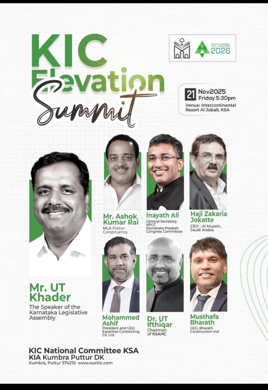 ನಾಳೆ ಸೌದಿ ಅರೇಬಿಯಾದ ಜುಬೈಲ್ ನಲ್ಲಿ ಕೆಐಸಿ ಎಲೆವೇಶನ್ ಸಮ್ಮಿಟ್ ಯುಟಿ ಖಾದರ್,ಶಾಸಕ ಅಶೋಕ್ ರೈ ಭಾಗಿ-ಕಹಳೆ ನ್ಯೂಸ್