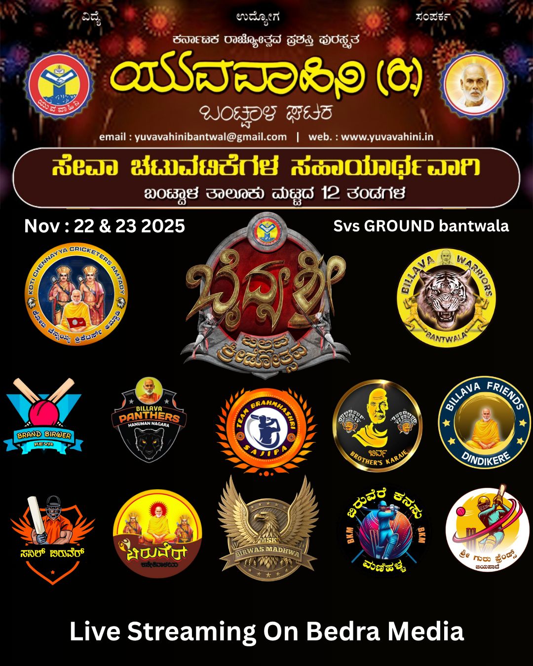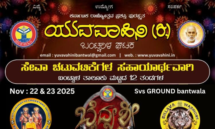 ಬಂಟ್ವಾಳ : ಯುವವಾಹಿನಿ (ರಿ.) ಬಂಟ್ವಾಳ ಘಟಕದ ಆಶ್ರಯದಲ್ಲಿ ಸೇವಾ ಚಟುವಟಿಕೆಗಳ ಸಹಾಯಾರ್ಥವಾಗಿ ಬಂಟ್ವಾಳ ತಾಲೂಕು ಮಟ್ಟದ 12 ತಂಡಗಳ ಬೈದ್ಯಶ್ರೀ ಪ್ರೀಮಿಯರ್ ಲೀಗ್ ಬಿಲ್ಲವ ಕ್ರಿಕೆಟ್ ಪಂದ್ಯಾಟ *ಬೈದ್ಯಶ್ರೀ ಟ್ರೋಫಿ 2025″ ನವೆಂಬರ್22 ಮತ್ತು 23 ರಂದು ಬಂಟ್ವಾಳ ಭಂಡಾರಿಬೆಟ್ಟು ಎಸ್ ವಿ ಎಸ್ ಶಾಲಾ ಮೈದಾನದಲ್ಲಿ ನಡೆಯಲಿದೆ.