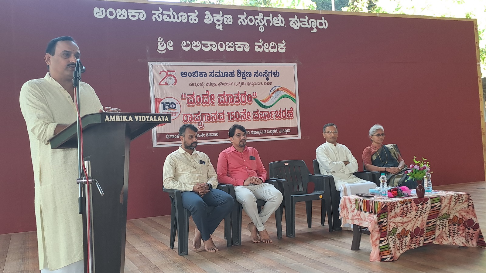 ಅವರು ನಗರದ ನಟ್ಟೋಜ ಫೌಂಡೇಶನ್ ಟ್ರಸ್ಟ್ ಮುನ್ನಡೆಸುತ್ತಿರುವ ಅಂಬಿಕಾ ಪದವಿಪೂರ್ವ ವಿದ್ಯಾಲಯಗಳ ಆಶ್ರಯದಲ್ಲಿ ಬಪ್ಪಳಿಗೆಯ ಅಂಬಿಕಾ ವಿದ್ಯಾಲಯ ಸಿಬಿಎಸ್ಇ ಸಂಸ್ಥೆಯ ಆವರಣದಲ್ಲಿನ ಶ್ರೀ ಶಂಕರ ಸಭಾಭವನದಲ್ಲಿ ವಂದೇ ಮಾತರಂ ರಾಷ್ಟ್ರಗಾನದ ನೂರ ಐವತ್ತನೇ ವರ್ಷಾಚರಣೆ ಪ್ರಯುಕ್ತ ಹೈಸ್ಕೂಲ್ ವಿದ್ಯಾರ್ಥಿಗಳಿಗಾಗಿ ಆಯೋಜಿಸಲಾದ ವಂದೇ ಮಾತರಂ ಗೀತೆಯ ಗಾಯನ ಸ್ಪರ್ಧೆಯನ್ನು ಉದ್ಘಾಟಿಸಿ ಶನಿವಾರ ಮಾತನಾಡಿದರು.