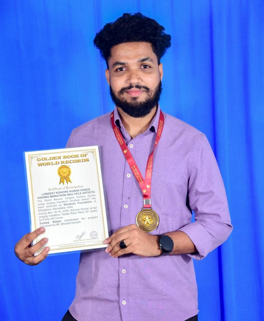 ಮಂಗಳೂರು ಪುರಭವನದಲ್ಲಿ ಷೋಡಶಿ ಫೌಂಡೇಶನ್ ನೇತೃತ್ವದಲ್ಲಿ’ಗಾತಾ ರಹೇ ಮೇರಾ ದಿಲ್’ ಎಂಬ ಹೆಸರಿನಲ್ಲಿ ದಿ| ಕಿಶೋರ್ ಕುಮಾರ್ ಅವರು ಹಾಡಿದ ಹಾಡುಗಳನ್ನು ಬರೋಬ್ಬರಿ 100 ಗಾಯಕರು ನಿರಂತರ 40 ಗಂಟೆ ‘ಕರೋಕೆ’ ಸ್ವರೂಪದಲ್ಲಿ ಹಾಡುವ ಮೂಲಕ ವಿಶ್ವದಾಖಲೆಯ ಗೋಲ್ಡನ್ ಬುಕ್ ಆಫ್ ವರ್ಲ್ಡ್ನಲ್ಲಿ ಹೆಸರು ನಮೂದಿಸಿದ್ದಾರೆ. ಈ ವಿಶ್ವದಾಖಲೆಯಲ್ಲಿ ಸಾಲ್ಯಾನ್ ಎಲ್ ಇಡಿ ಉತ್ತಮವಾಗಿ ಕಾರ್ಯನಿರ್ವಹಿಸಿತ್ತು. ಇದೀಗ ಈ ಸಾಧನೆಗೆ ಸುದೀಪ್ ಸಾಲ್ಯಾನ್ ಅವರಿಗೆ ‘ಗೋಲ್ಡನ್ ಬುಕ್ ಆಫ್ ವರ್ಲ್ಡ್ ರೆಕಾರ್ಡ್ಸ್’ ವತಿಯಿಂದ ಪದಕ, ಸರ್ಟಿಫಿಕೇಟ್ ನೀಡಿ ಗೌರವಿಸಲಾಗಿದೆ.
