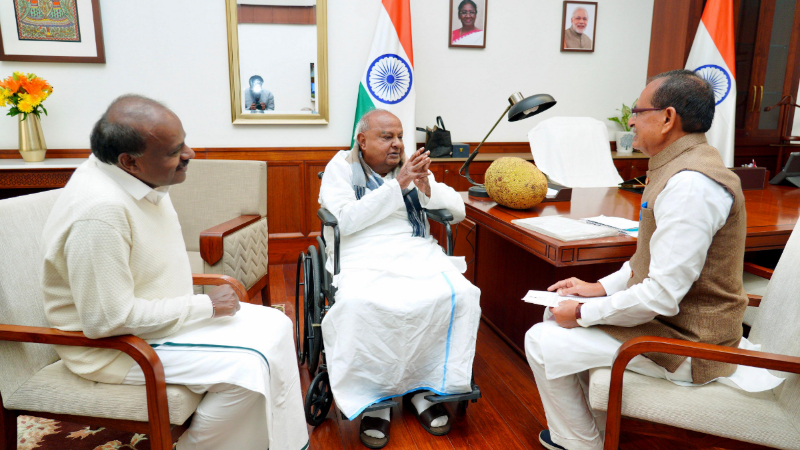 ಸಂಸತ್ ಭವನದಲ್ಲಿ ಕೇಂದ್ರದ ಬೃಹತ್ ಕೈಗಾರಿಕೆ ಮತ್ತು ಉಕ್ಕು ಸಚಿವ ಹೆಚ್.ಡಿ.ಕುಮಾರಸ್ವಾಮಿ ಅವರೊಂದಿಗೆ ಕೃಷಿ ಸಚಿವರನ್ನು ಭೇಟಿಯಾದ ಮಾಜಿ ಪ್ರಧಾನಿ ತಮ್ಮ ಪ್ರಸ್ತಾವನೆ ಕುರಿತ ಪತ್ರವನ್ನು ನೀಡಿದರು.