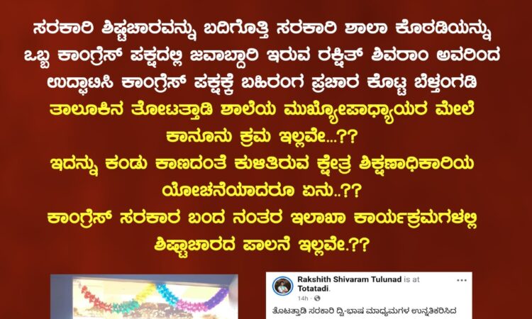 ತೋಟತ್ತಾಡಿ ಸರಕಾರಿ ದ್ವಿ-ಭಾಷ ಮಾಧ್ಯಮಗಳ ಉನ್ನತಿಕರಿಸಿದ ಪ್ರಾಥಮಿಕ ಶಾಲೆಯ ವಾರ್ಷಿಕೋತ್ಸವ ಮತ್ತು ಗ್ರಂಥಾಲಯ ಕೊಠಡಿಯ ಉದ್ಘಾಟನೆಯ ಸಮಾರಂಭದಲ್ಲಿ ಕೆಪಿಸಿಸಿ ಪ್ರಧಾನ ಕಾರ್ಯದರ್ಶಿ ರಕ್ಷಿತ್ ಶಿವರಾಂ ಭಾಗವಹಿಸಿ ಕೊಠಡಿ ಉದ್ಘಾಟನೆಯನ್ನು ನಡೆಸಿದ್ದರು ಇದು ಸರಕಾರಿ ಕಾರ್ಯಕ್ರಮಗಳ ಶಿಷ್ಟಾಚಾರವಾಗಿದ್ದು ಒಬ್ಬ ರಾಜಕೀಯ ಪಕ್ಷದವರಾಗಿದ್ದು ಉದ್ಘಾಟಿಸಿದ್ದನ್ನು ಸಾರ್ವಜನಿಕರು ವ್ಯಾಪಕ ಖಂಡಿಸಿದ್ದು. ಅದಲ್ಲದೆ ಭಾರತೀಯ ಜನತಾ ಪಾರ್ಟಿ ಕಾರ್ಯಕರ್ತರು ಮುಂದಿನ ದಿನಗಳಲ್ಲಿ ಬಿಜೆಪಿ ಸರ್ಕಾರ ಆಡಳಿತ ಬಂದಾಗ ಸರಕಾರಿ ಕಾರ್ಯಕ್ರಮವನ್ನು ಬಿಜೆಪಿ ಕಾರ್ಯಕರ್ತರೇ ನೆರವೇರಿಸುತ್ತೇವೆಂದು ಬಹಿರಂಗ ಸವಾಲು ಹಾಕಿದ್ದಾರೆ