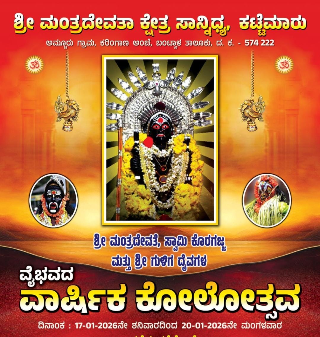 ಬಂಟ್ವಾಳ : ಬಂಟ್ವಾಳ ತಾಲೂಕಿನ ಅಮ್ಟೂರು ಗ್ರಾಮದ ಶ್ರೀ ಮಂತ್ರ ದೇವತಾ ಕ್ಷೇತ್ರ ಸಾನಿಧ್ಯ ಕಟ್ಟೆಮಾರ್ ನಲ್ಲಿ ಶ್ರೀಮಂತ್ರ ದೇವತೆ, ಸ್ವಾಮಿ ಕೊರಗಜ್ಜ, ಮತ್ತು ಶ್ರೀ ಗುಳಿಗ ದೈವಗಳ ವೈಭವದ ವಾರ್ಷಿಕ ಕೋಲೊತ್ಸವ ದಿನಾಂಕ 17 -01=2026 ಶನಿವಾರ ದಿಂದ 20-1-2026 ಮಂಗಳವಾರ ತನಕ ನಡೆಯಲಿರುವುದು.