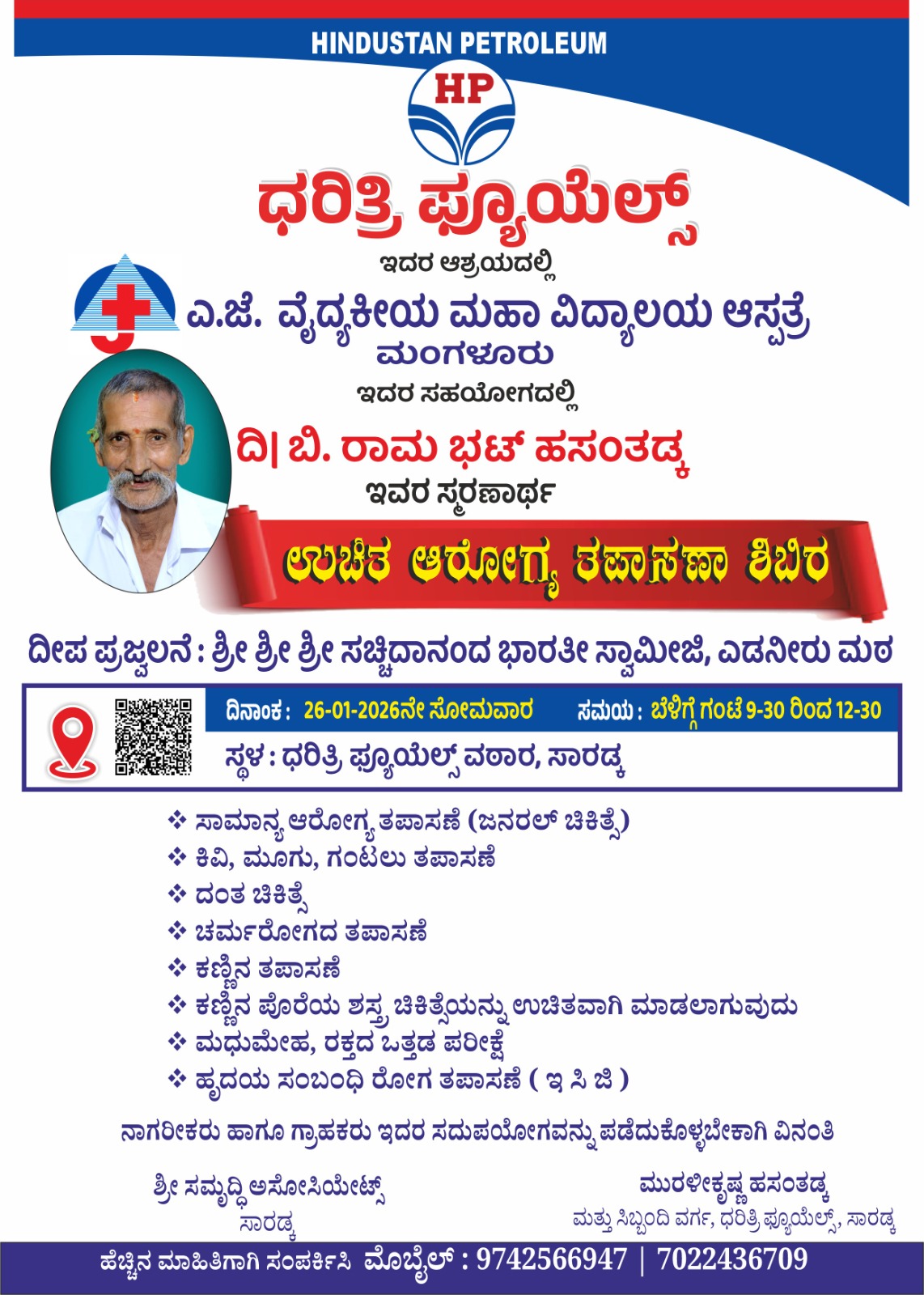 ಧರಿತ್ರಿ ಫೂಯೆಲ್ಸ್ ಇದರ ಆಶ್ರಯದಲ್ಲಿ ಎ.ಜೆ. ವೈದ್ಯಕೀಯ ಮಹಾ ವಿದ್ಯಾಲಯ ಆಸ್ಪತ್ರೆ ಮಂಗಳೂರು ಇದರ ಸಹಯೋಗದಲ್ಲಿ ದಿ| ಬಿ. ರಾಮ ಭಟ್ ಹಸಂತಡ್ಕ ಇವರ ಸ್ಮರಣಾರ್ಥ ಉಚಿತ ಆರೋಗ್ಯ ತಪಾಸಣಾ ಶಿಬಿರವು ಧರಿತ್ರಿ ಪ್ಯೂಯೆಲ್ಸ್ ವಠಾರ ಸಾರಡ್ಕದಲ್ಲಿ ನಡೆಯಲಿದೆ.