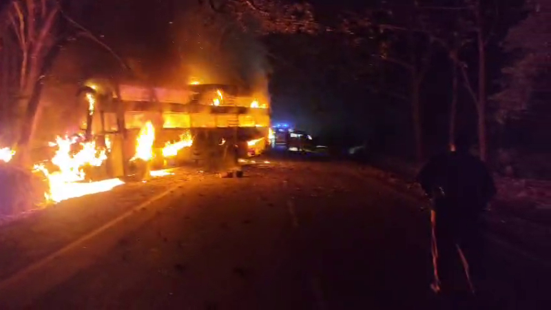 ಶಿವಮೊಗ್ಗ: ಖಾಸಗಿ ಸ್ಲೀಪರ್ ಬಸ್ವೊಂದು ಧಗಧಗನೆ ಹೊತ್ತಿ ಉರಿದಿದ್ದು, ಸಂಪೂರ್ಣ ಸುಟ್ಟು ಕರಕಲಾಗಿದೆ. ಅದೃಷ್ಟವಶಾತ್ ಬಸ್ನಲ್ಲಿದ್ದ ಪ್ರಯಾಣಿಕರು ಅಪಾಯದಿಂದ ಪಾರಾಗಿದ್ದಾರೆ. ಹೊಸನಗರ ತಾಲೂಕಿನ ಅರಸಾಳು ಹಾಗೂ ಸೂಡೂರು ಗೇಟ್ ಬಳಿ ಈ ಘಟನೆ ನಡೆದಿದೆ. ಚಾಲಕ, ಕ್ಲೀನರ್ ಸೇರಿದಂತೆ 40 ಮಂದಿ ಬಸ್ನಲ್ಲಿ ಪ್ರಯಾಣಿಸುತ್ತಿದ್ದರು. ಎಲ್ಲರೂ ಸೇಫ್ ಆಗಿದ್ದಾರೆ.