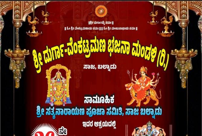 ಶ್ರೀ ದುರ್ಗಾ-ವೆಂಕಟ್ರಮಣ ಭಜನಾ ಮಂಡಳಿ (ರಿ.) ಸಾಜ, ಬಲ್ನಾಡು ಹಾಗೂ ಸಾಮೂಹಿಕ ಶ್ರೀ ಸತ್ಯನಾರಾಯಣ ಪೂಜಾ ಸಮಿತಿ, ಸಾಜ ಬಲ್ನಾಡು ಇದರ ಆಶ್ರಯದಲ್ಲಿ ಫೆ.14ರಂದು 36ನೇ ವರ್ಷದ ಸಾಮೂಹಿಕ ಶ್ರೀ ಸತ್ಯನಾರಾಯಣ ಪೂಜೆ ಶ್ರೀ ದುರ್ಗಾ-ವೆಂಕಟ್ರಮಣ ಭಜನಾ ಮಂದಿರದಲ್ಲಿ ನಡೆಯಲಿದೆ.