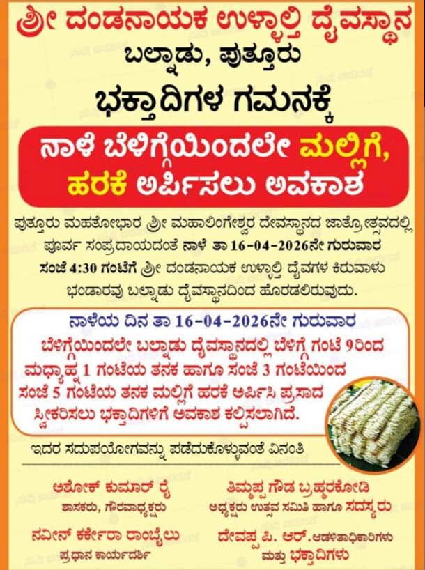 ಪುತ್ತೂರು ಮಹತೋಭಾರ ಶ್ರೀ ಮಹಾಲಿಂಗೇಶ್ವರ ದೇವಸ್ಥಾನದ ಜಾತ್ರೋತ್ಸವದಲ್ಲಿ ಪೂರ್ವ ಸಂಪ್ರದಾಯದಂತೆ ಏ.16 ರಂದು ಸಂಜೆ.4.30ಕ್ಕೆ ಶ್ರೀ ದಂಡನಾಯಕ ಉಳ್ಳಾಳ್ತಿ ದೈವಗಳ ಕಿರುವಾಳು ಭಂಡಾರವು ಬಲ್ನಾಡು ದೈವಸ್ಥಾನದಿಂದ ಹೊರಡಲಿರುವುದು.