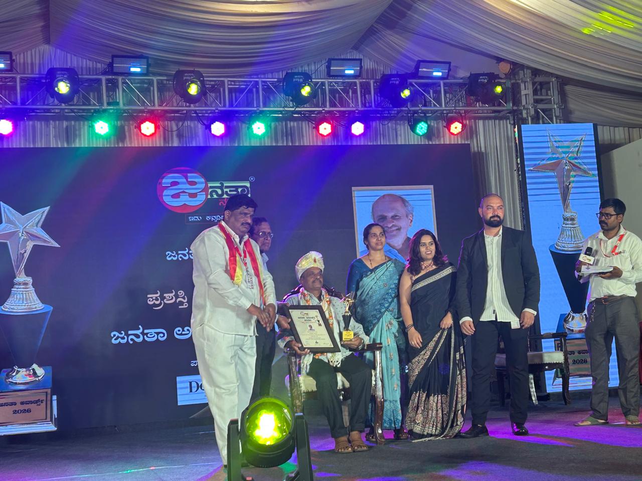 ಜನತಾ ನ್ಯೂಸ್ ಕನ್ನಡ ವತಿಯಿಂದ ಆಯೋಜಿಸಲಾಗಿರುವ ವಿವಿಧ ಕ್ಷೇತ್ರಗಳಲ್ಲಿ ಸಾಧನೆ ಮಾಡಿರುವ ಕುಮಾರ ಪೆರ್ನಾಜೆ ಅವರನ್ನು ಇತ್ತೀಚೆಗೆ ಬೆಂಗಳೂರಿನ ನಾಗರಬಾವಿ ಕೆಎಲ್ಇ ಕಾನೂನು ಕಾಲೇಜ್ ಹತ್ತಿರ ಅರಮನೆ ವೆನ್ಯು ನಲ್ಲಿ ಮನರಂಜನೆ ಫ್ಯಾಶನ್ ಶೋ ಮ್ಯೂಸಿಕಲ್ ನೈಟ್ ನೃತ್ಯ ಸಂಜೆ ವೈವಿಧ್ಯಮಯ ಕಾರ್ಯಕ್ರಮಗಳೊಂದಿಗೆ ಏರ್ಪಡಿಸಲಾಗಿದ್ದ ಕಾರ್ಯಕ್ರಮದಲ್ಲಿ ಜೇನು ಕೃಷಿ ಕ್ಷೇತ್ರದಲ್ಲಿನ ಸಾಧನೆಗಳ ಸರದಾರನಿಗೆ ಗಣನೀಯ ಸೇವೆ ಸಾಧನೆ ಹಾಗೆ ಇವರ ಪ್ರತಿಭೆಯನ್ನು ಪರಿಗಣಿಸಿ ಜನತಾ ಕೃಷಿ ರತ್ನ ವನ್ನು ಆರ್ಯನ್ ಭಾರದ್ವಾಜ್ ಜನತಾ ನ್ಯೂಸ್ ಮ್ಯಾನೇಜಿಂಗ್ ಡೈರೆಕ್ಟರ್ ಪೇಟ ಶಾಲು ತೊಡಿಸಿ ಹಾರ ಟ್ರೋಪಿ ವಿಶೇಷ ರೀತಿಯ ಟ್ರೋಫಿ ಪ್ರಶಸ್ತಿ ಪತ್ರವನ್ನು ಪ್ರಧಾನ ಮಾಡಿದರು.