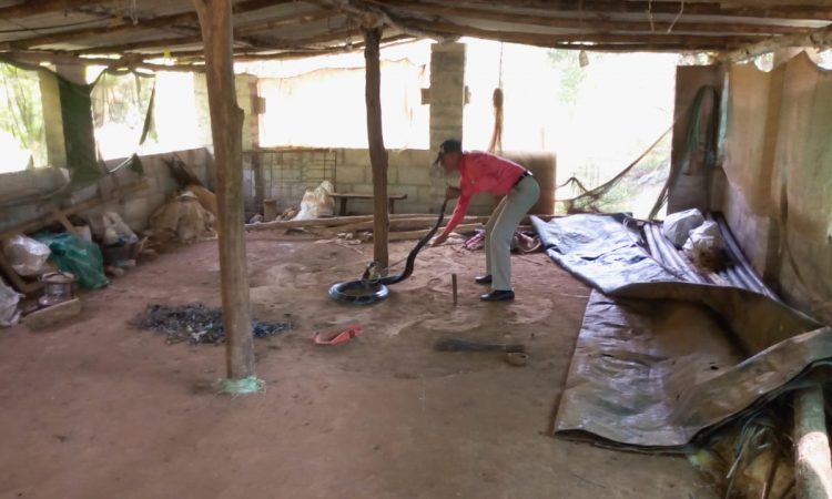 ಕೂಡಲೇ ಉರಗತಜ್ಞ ಹರೀಂದ್ರಾಗೆ ವಿಷಯ ಮುಟ್ಟಿಸಿದ್ದಾರೆ. ಸ್ಥಳಕ್ಕೆ ಬಂದ ಸ್ನೇಕ್ ಹರೀಂದ್ರ, ಕೊಟ್ಟಿಗೆಯಲ್ಲಿ ಸಾಮಾನುಗಳನ್ನ ತುಂಬಿದ್ರಿಂದ ತಪ್ಪಿಸಿಕೊಳ್ಳಲು ಯತ್ನಿಸುತ್ತಿದ್ದ ಕಾಳಿಂಗನನ್ನ ಸುಮಾರು ಒಂದು ಗಂಟೆಗಳ ಕಾಲ ಕಾರ್ಯಾಚರಣೆ ನಡೆಸಿ ಸೆರೆ ಹಿಡಿದಿದ್ದಾರೆ.
